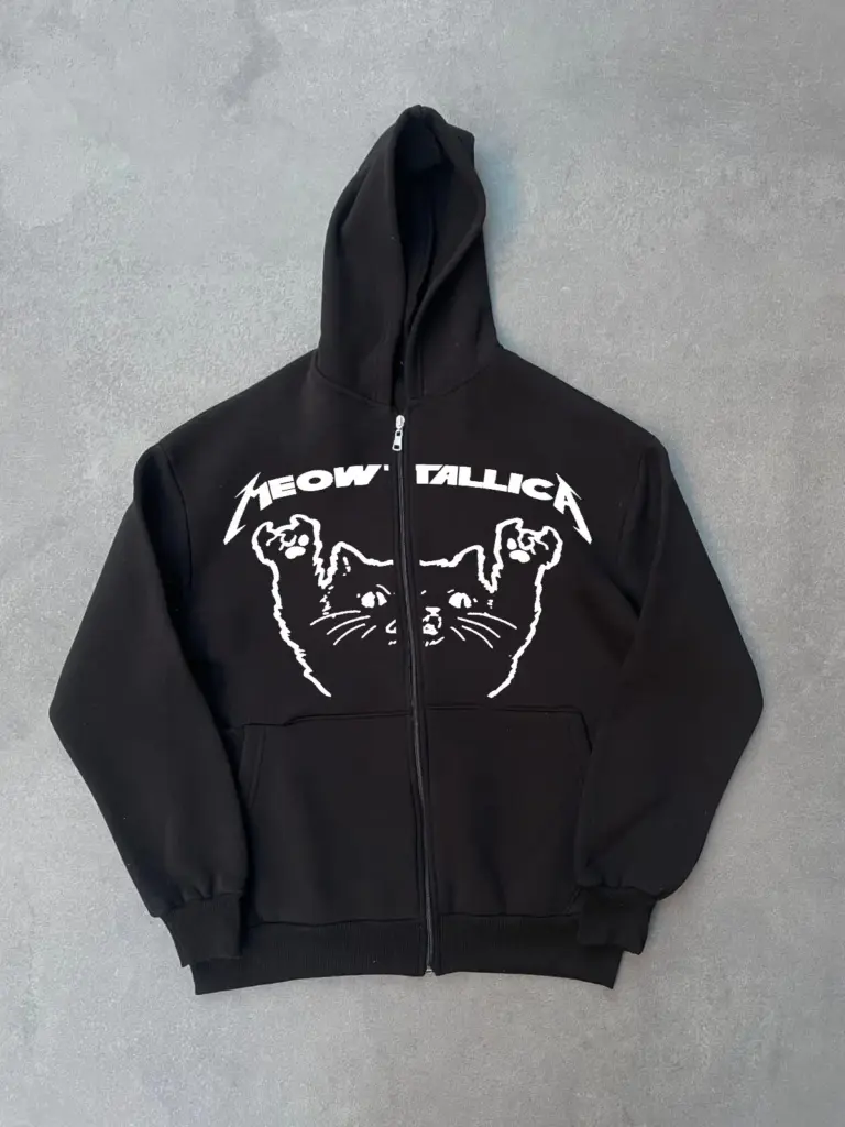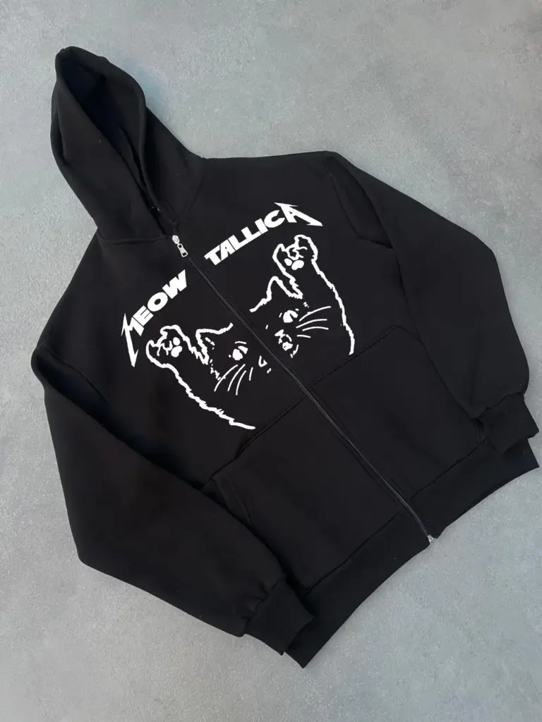 3 iplik Kışlık Baskılı Fermuarlı Kapüşonlu Hırka – Siyah