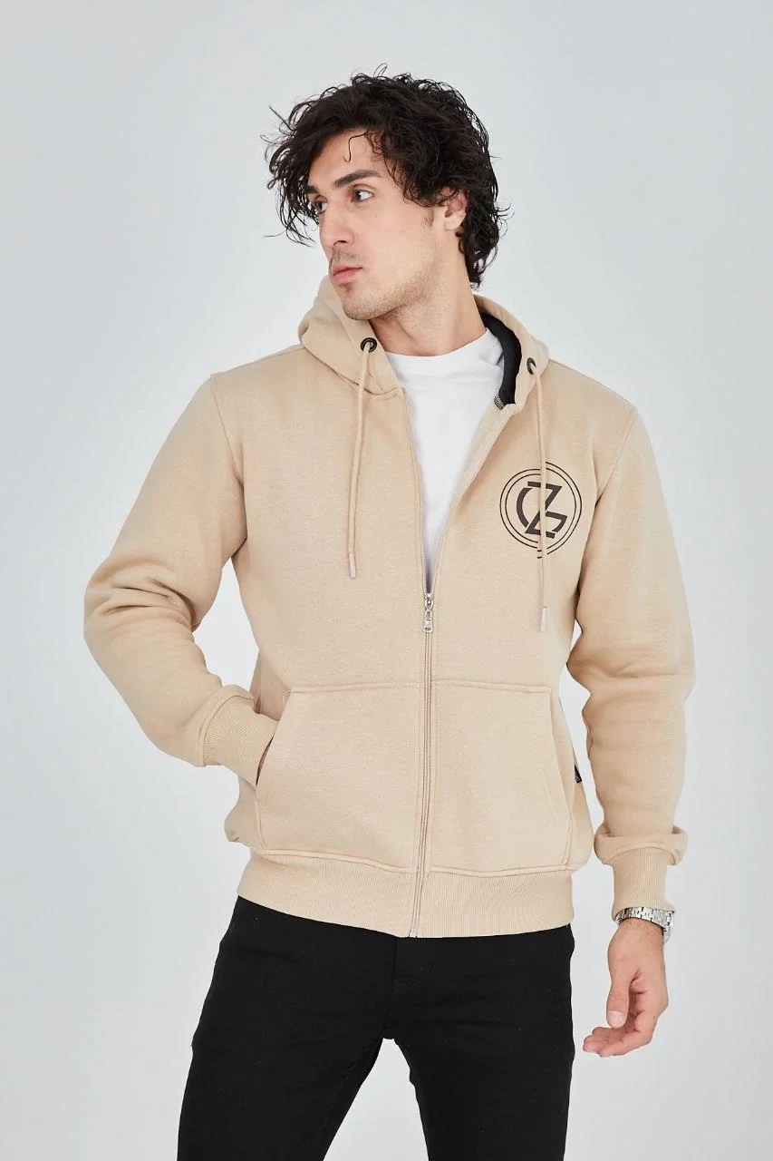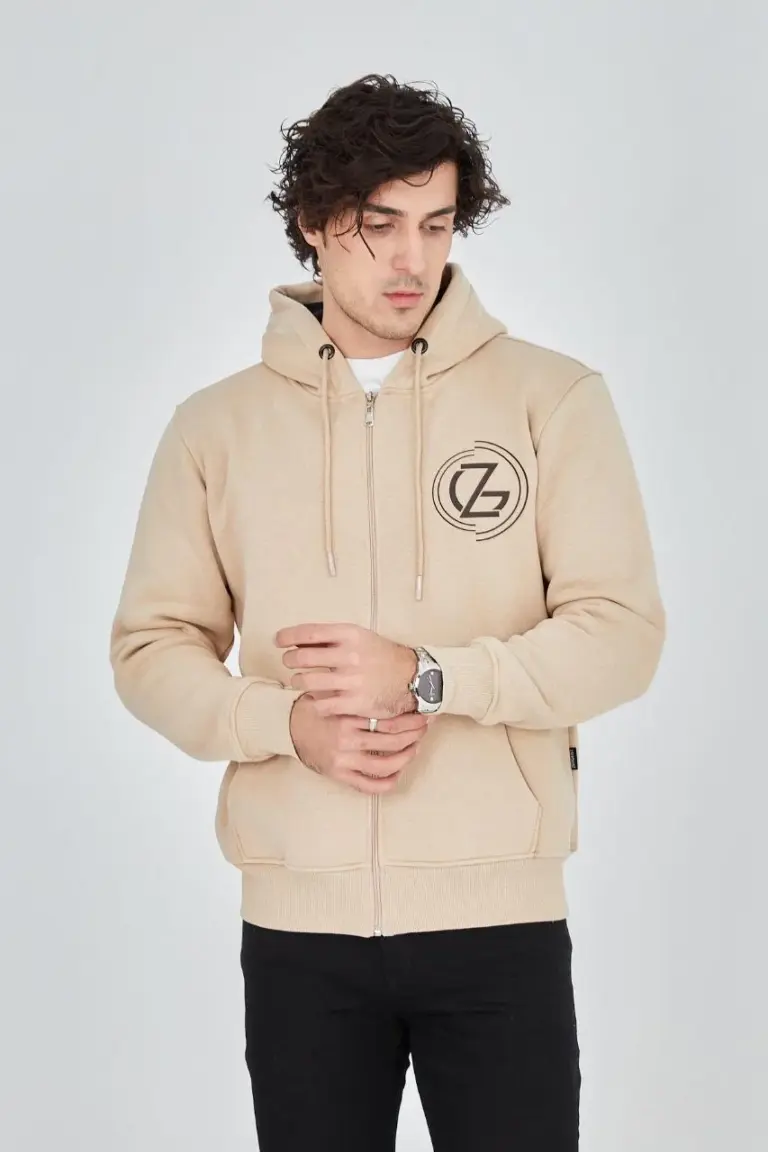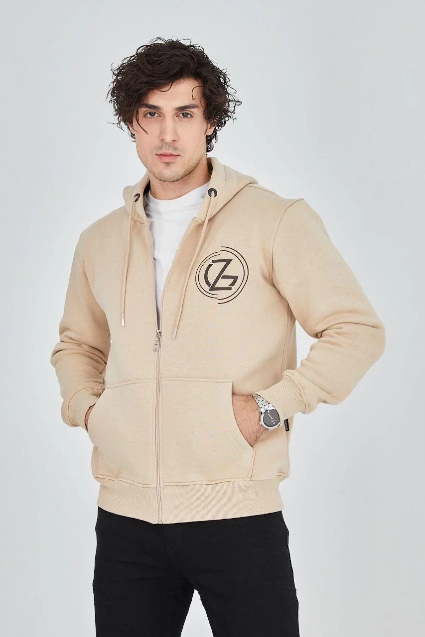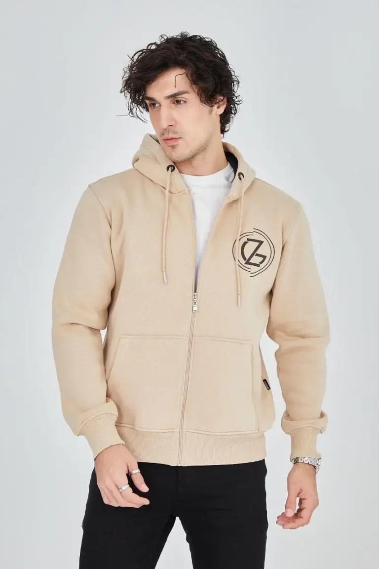 3 İplik Pamuklu Fermuarlı Kapüşonlu Kanguru Cepli Baskılı Hoodie Hırka Sweatshirt – Bej