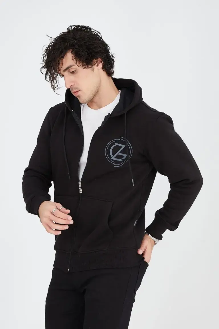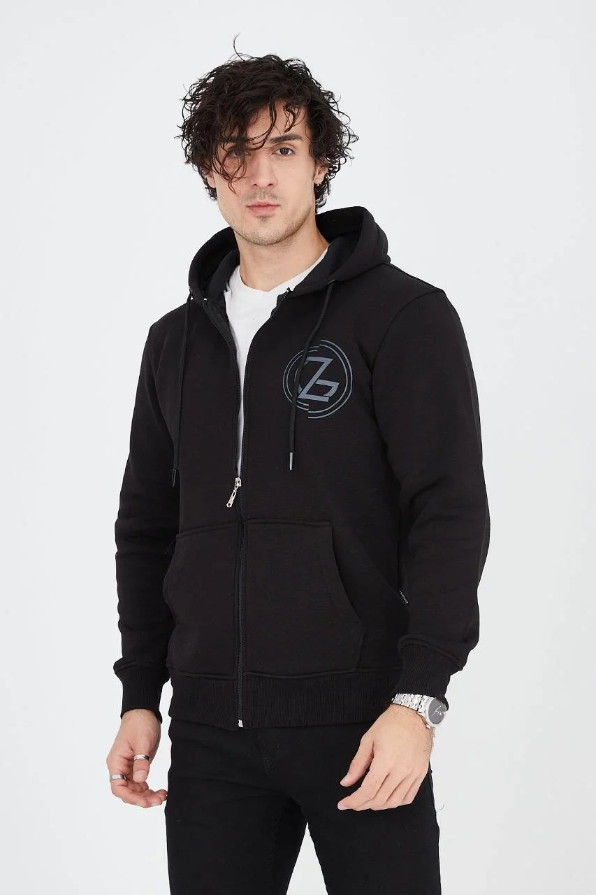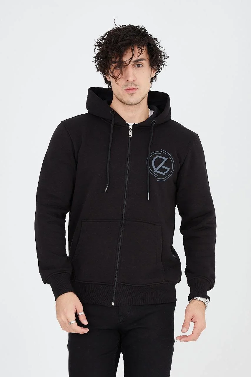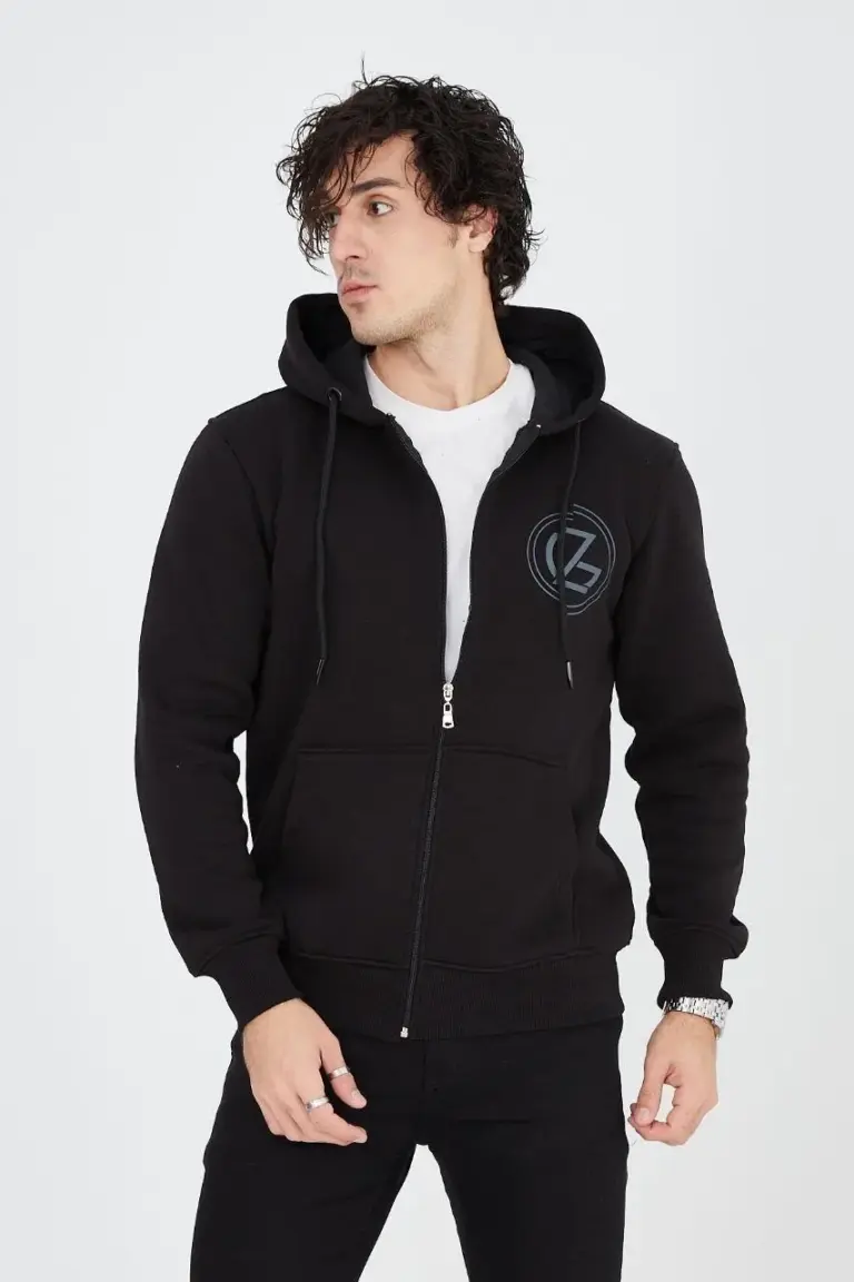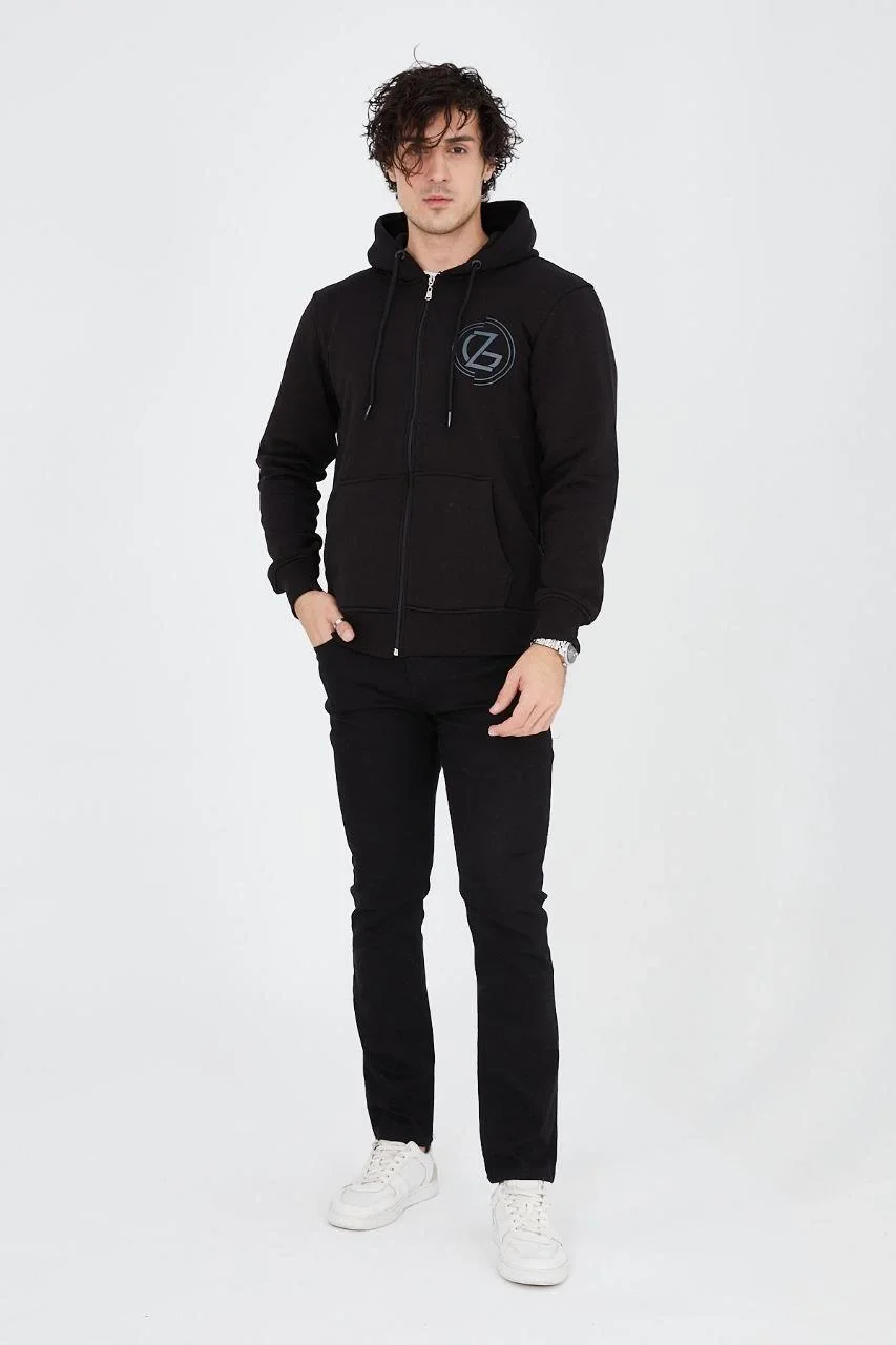 3 İplik Pamuklu Fermuarlı Kapüşonlu Kanguru Cepli Baskılı Hoodie Hırka Sweatshirt – Siyah