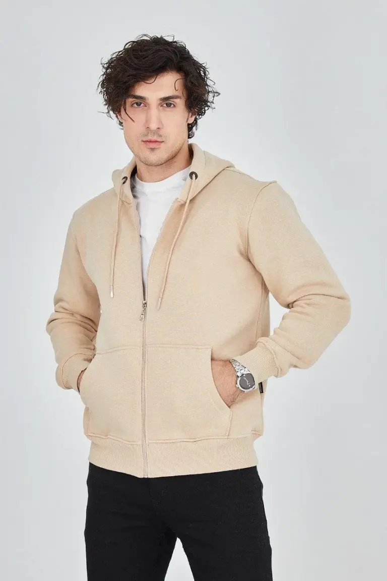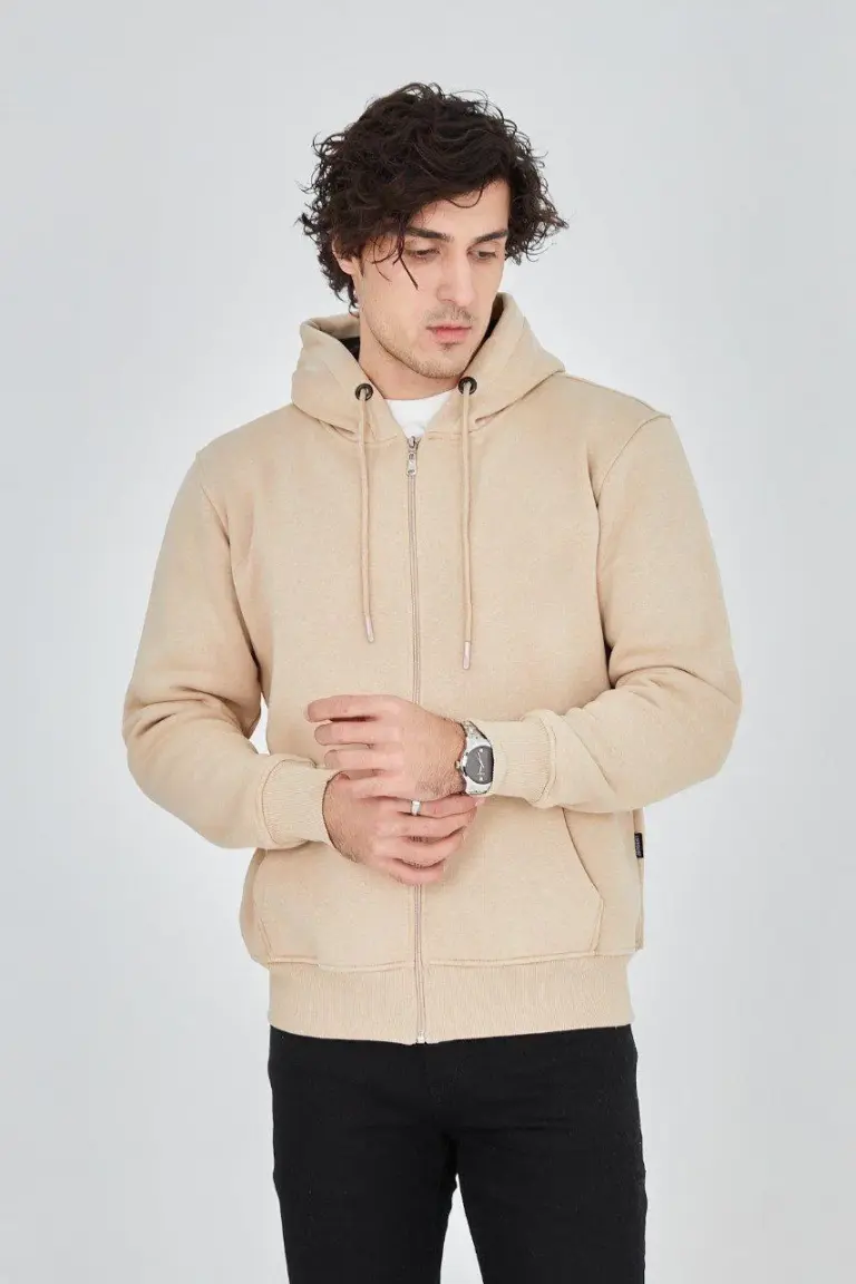 3 İplik Pamuklu Fermuarlı Kapüşonlu Kanguru Cepli Hoodie Hırka Sweatshirt -Bej