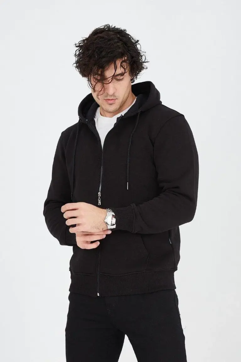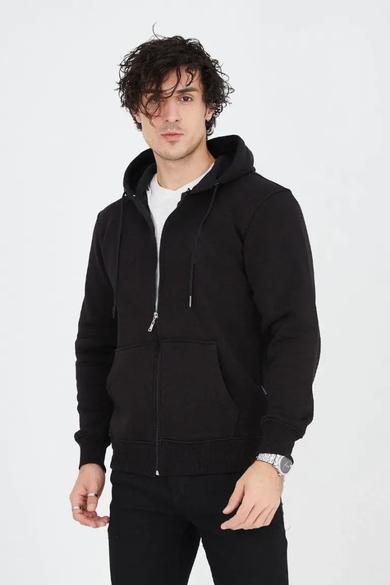 3 İplik Pamuklu Fermuarlı Kapüşonlu Kanguru Cepli Hoodie Hırka Sweatshirt – Siyah