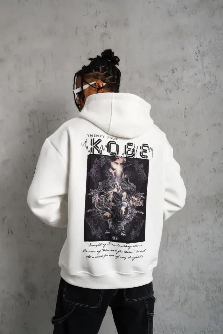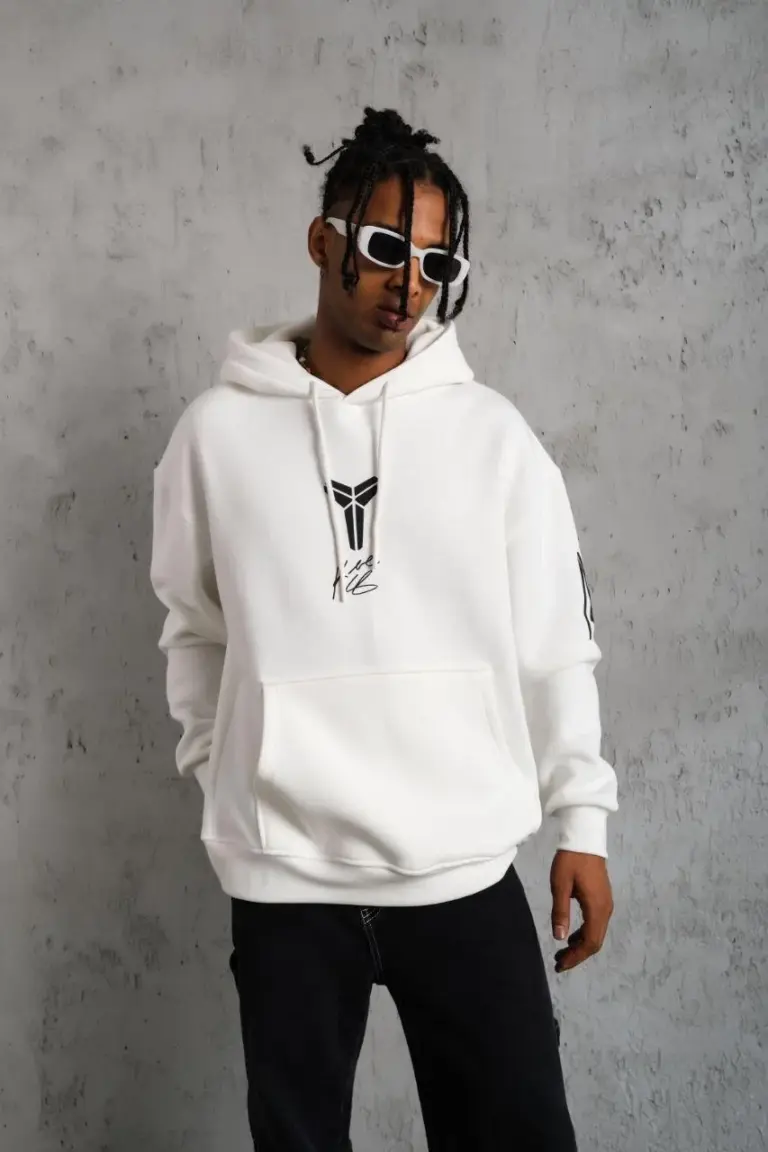 3 İplik Pamuklu Kapüşonlu Baskılı Cepli Oversize Sweatshirt Hoodie – Beyaz