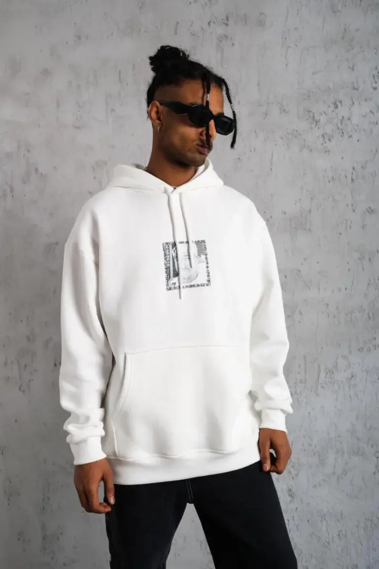 3 İplik Pamuklu Kapüşonlu Baskılı Cepli Oversize Sweatshirt Hoodie – Beyaz