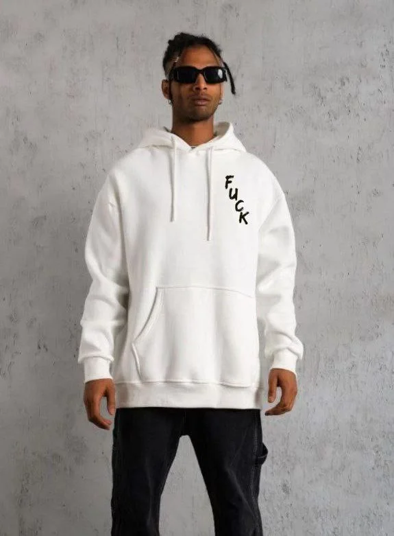 3 İplik Pamuklu Kapüşonlu Baskılı Cepli Oversize Sweatshirt Hoodie – Beyaz