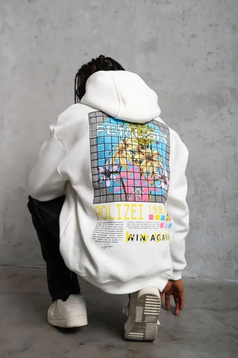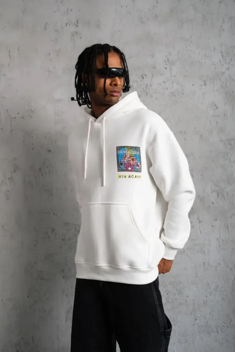 3 İplik Pamuklu Kapüşonlu Baskılı Cepli Oversize Sweatshirt Hoodie – Beyaz
