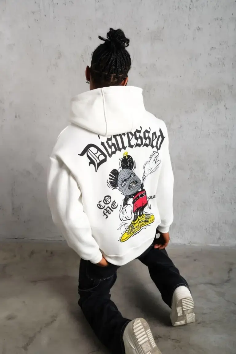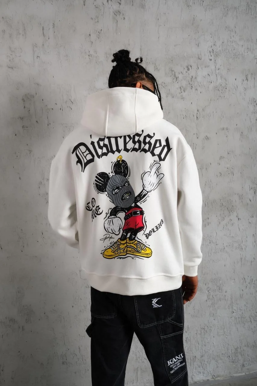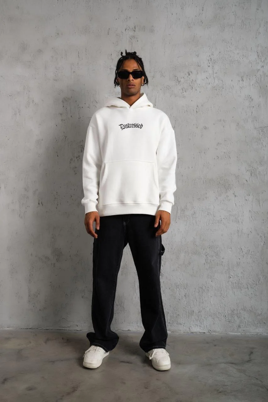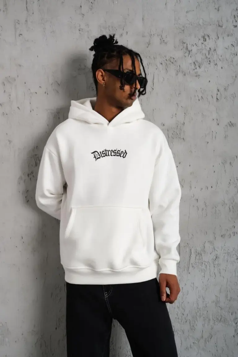 3 İplik Pamuklu Kapüşonlu Baskılı Cepli Oversize Sweatshirt Hoodie – Beyaz