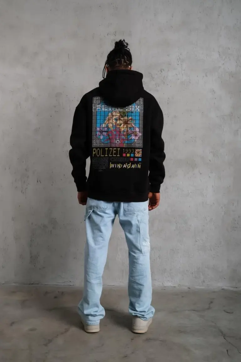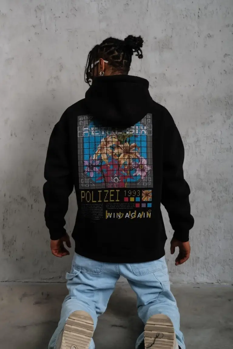3 İplik Pamuklu Kapüşonlu Baskılı Cepli Oversize Sweatshirt Hoodie – Siyah