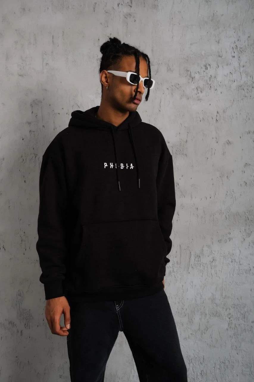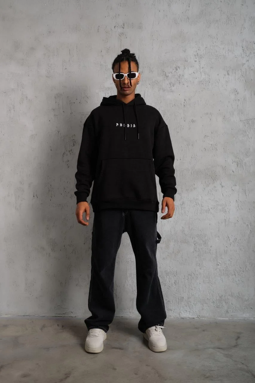 3 İplik Pamuklu Kapüşonlu Baskılı Cepli Oversize Sweatshirt Hoodie – Siyah