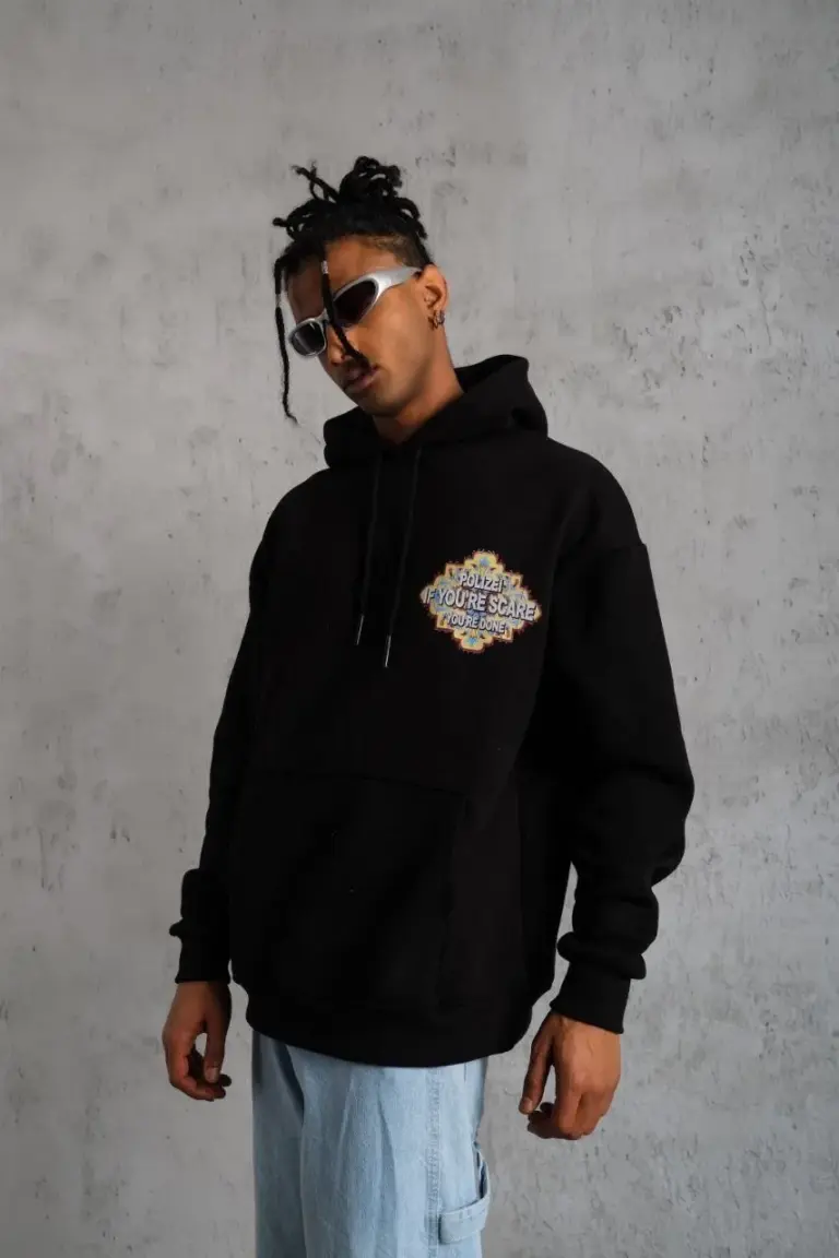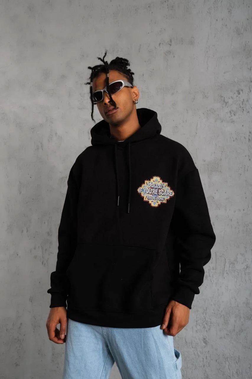 3 İplik Pamuklu Kapüşonlu Baskılı Cepli Oversize Sweatshirt Hoodie – Siyah