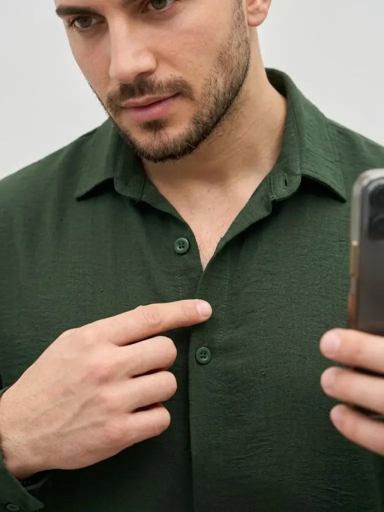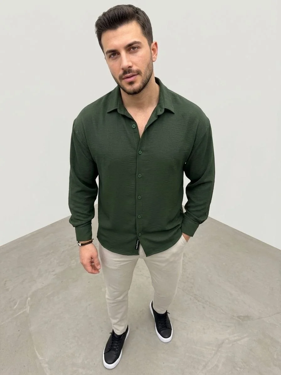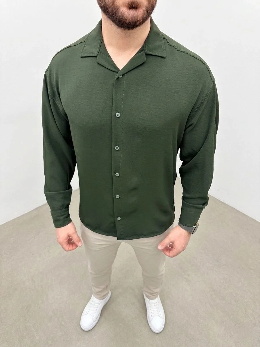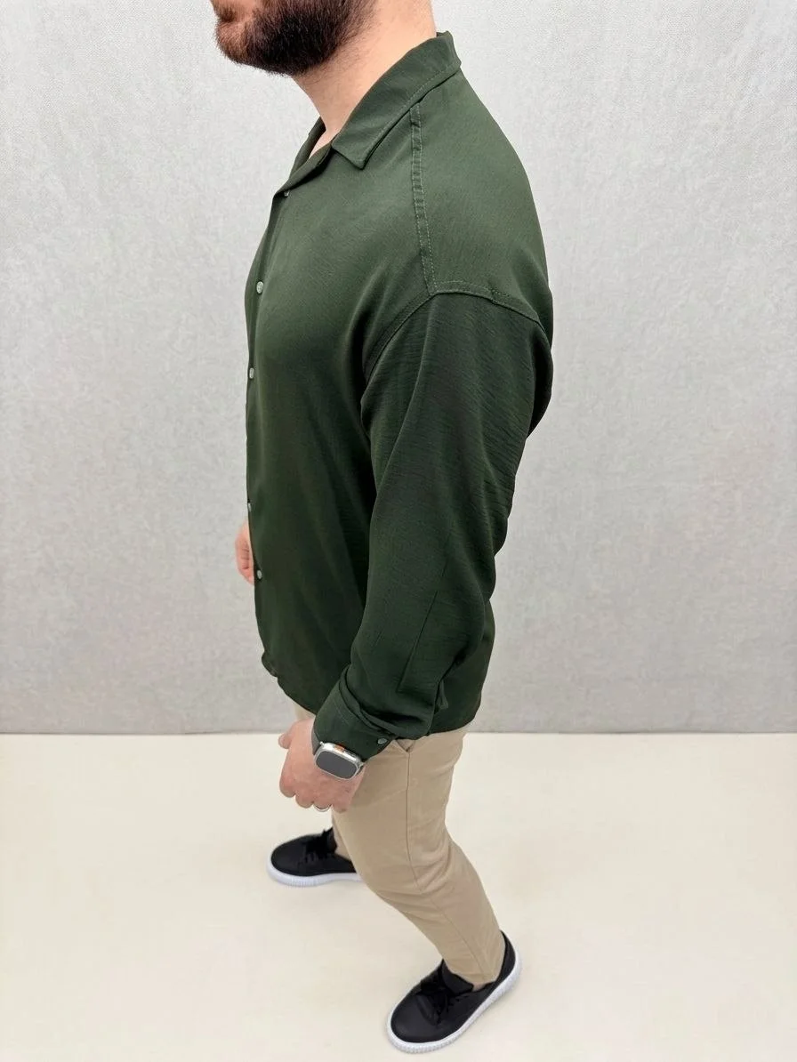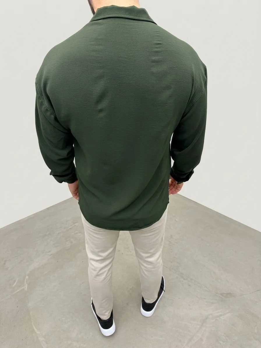 Aerobin Kumaş Oversize 4 Mevsim Uzun Kollu Rahat Kalıp Gömlek – Haki