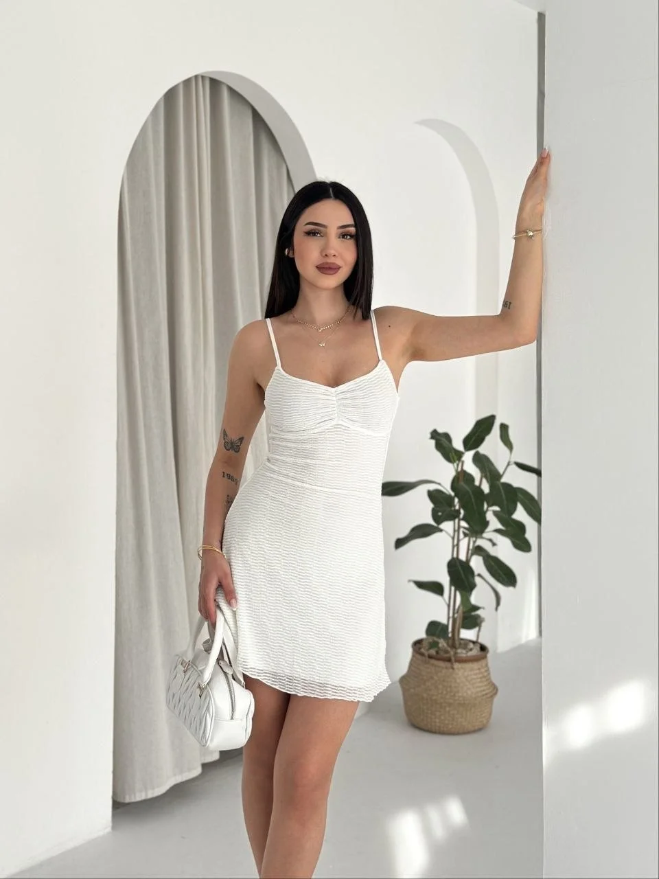 Askılı Mini Elbise Drapeli Göğüs Detay Likralı Yazlık Fit – Beyaz