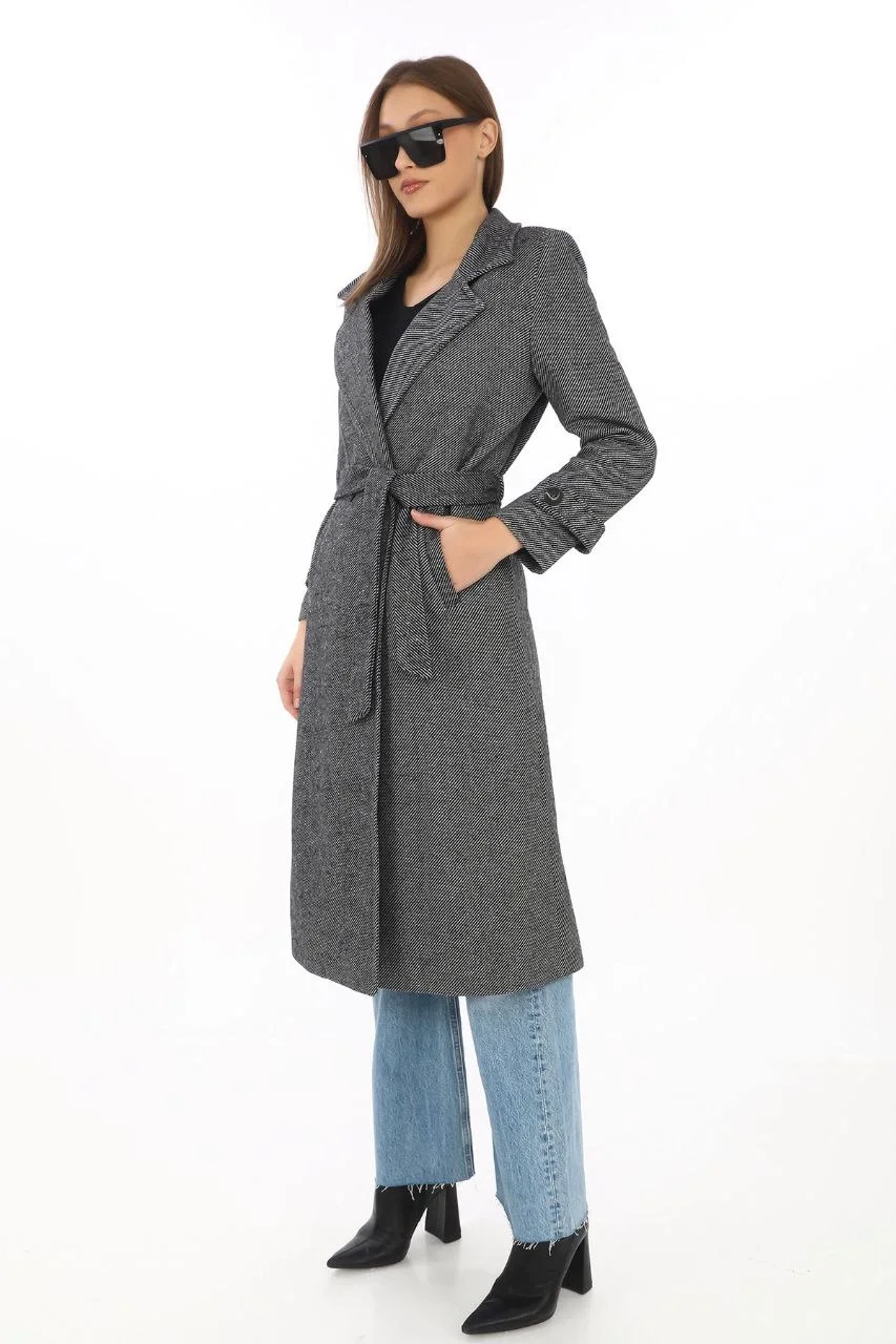 Balık Sırtı Kaşe Kaban Uzun Boy Kruvaze Yaka Kuşaklı Astarlı Tesettür Kaban – Füme