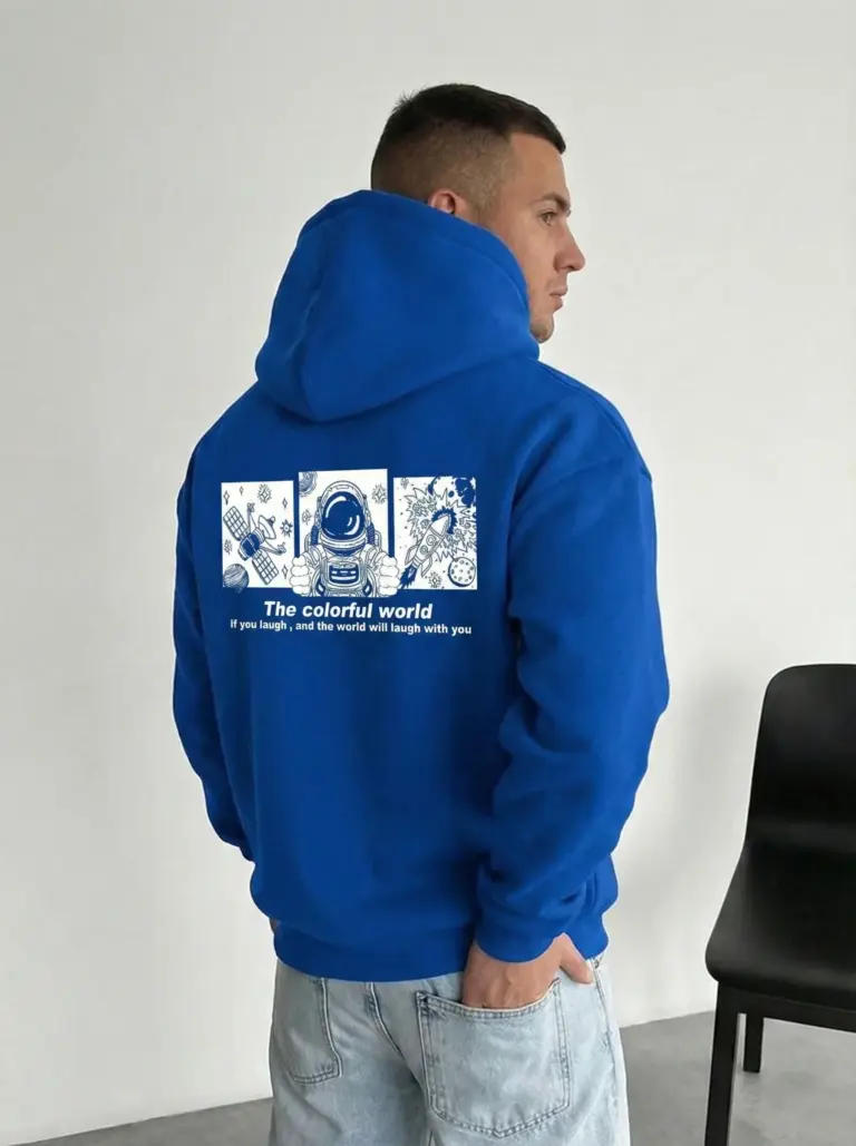 Baskılı Kapüşonlu Cepli Hoodie 3 İplik Pamuklu Sweatshirt – Saks Mavisi