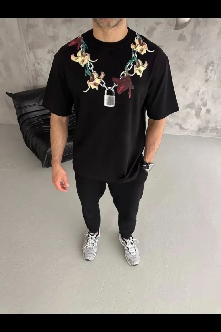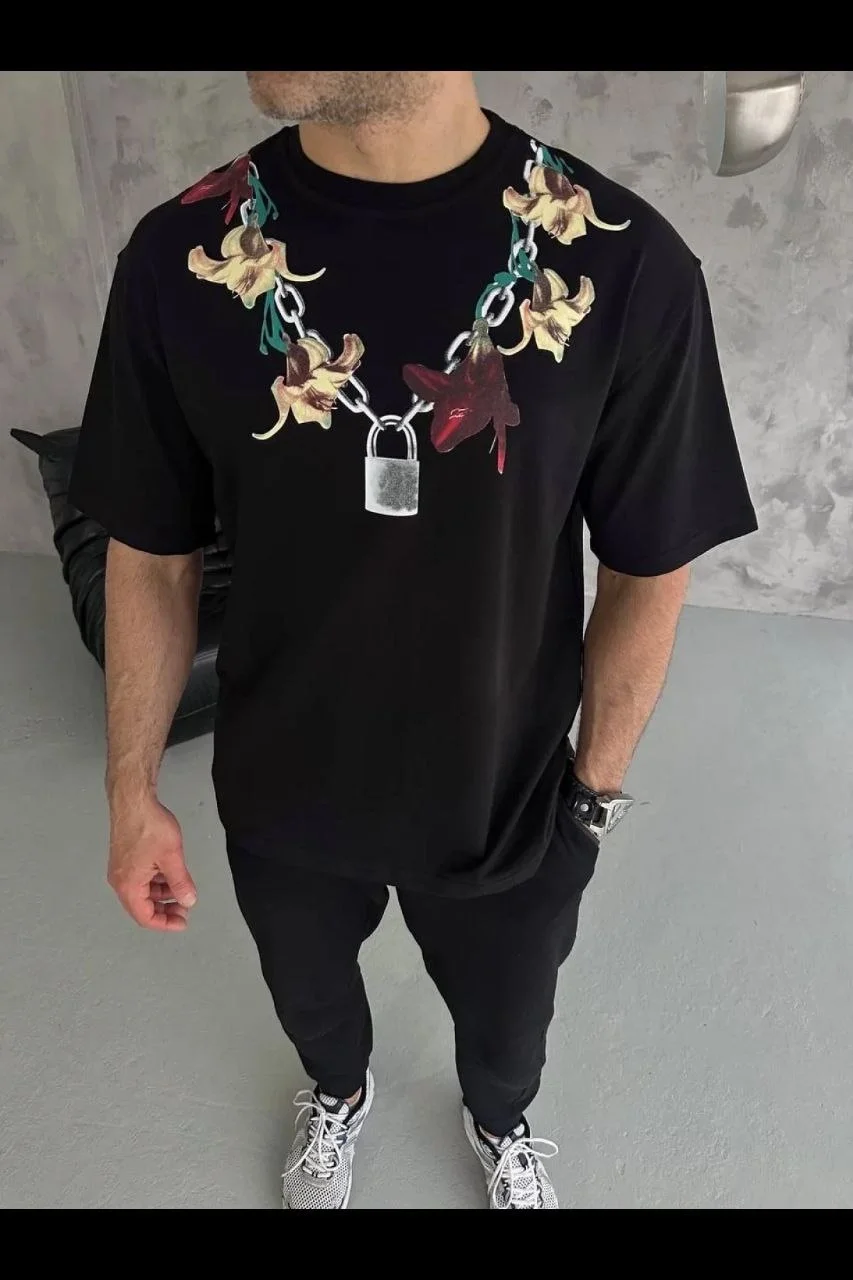 Baskılı T-Shirt Kısa Kol Bisiklet Yaka Regular Fit Rahat Tişört – Siyah