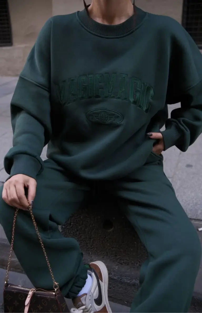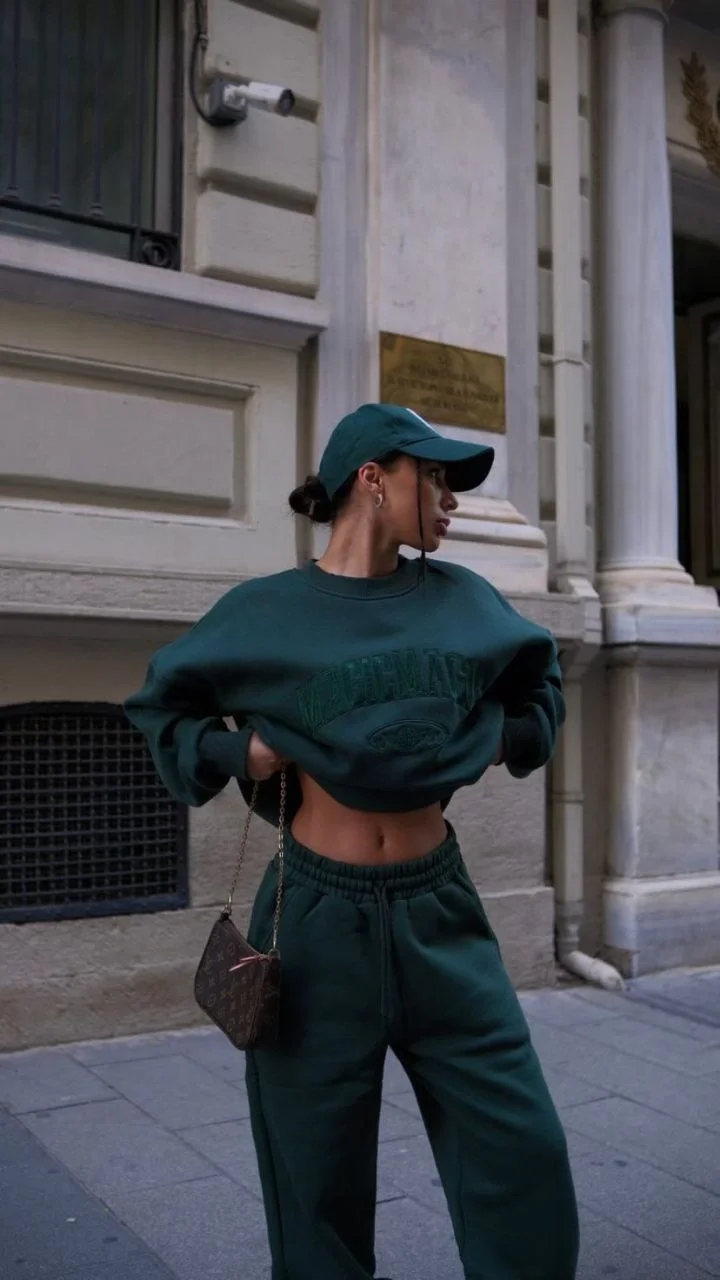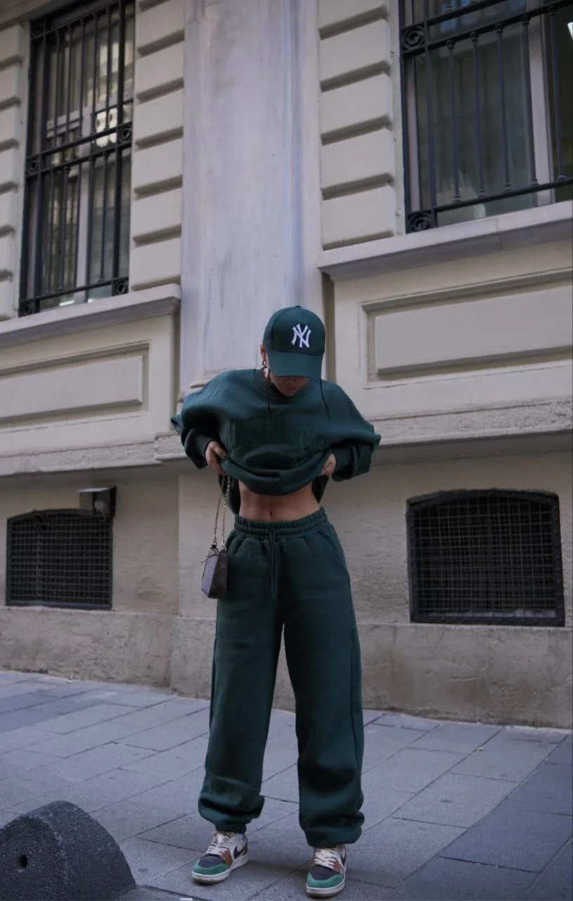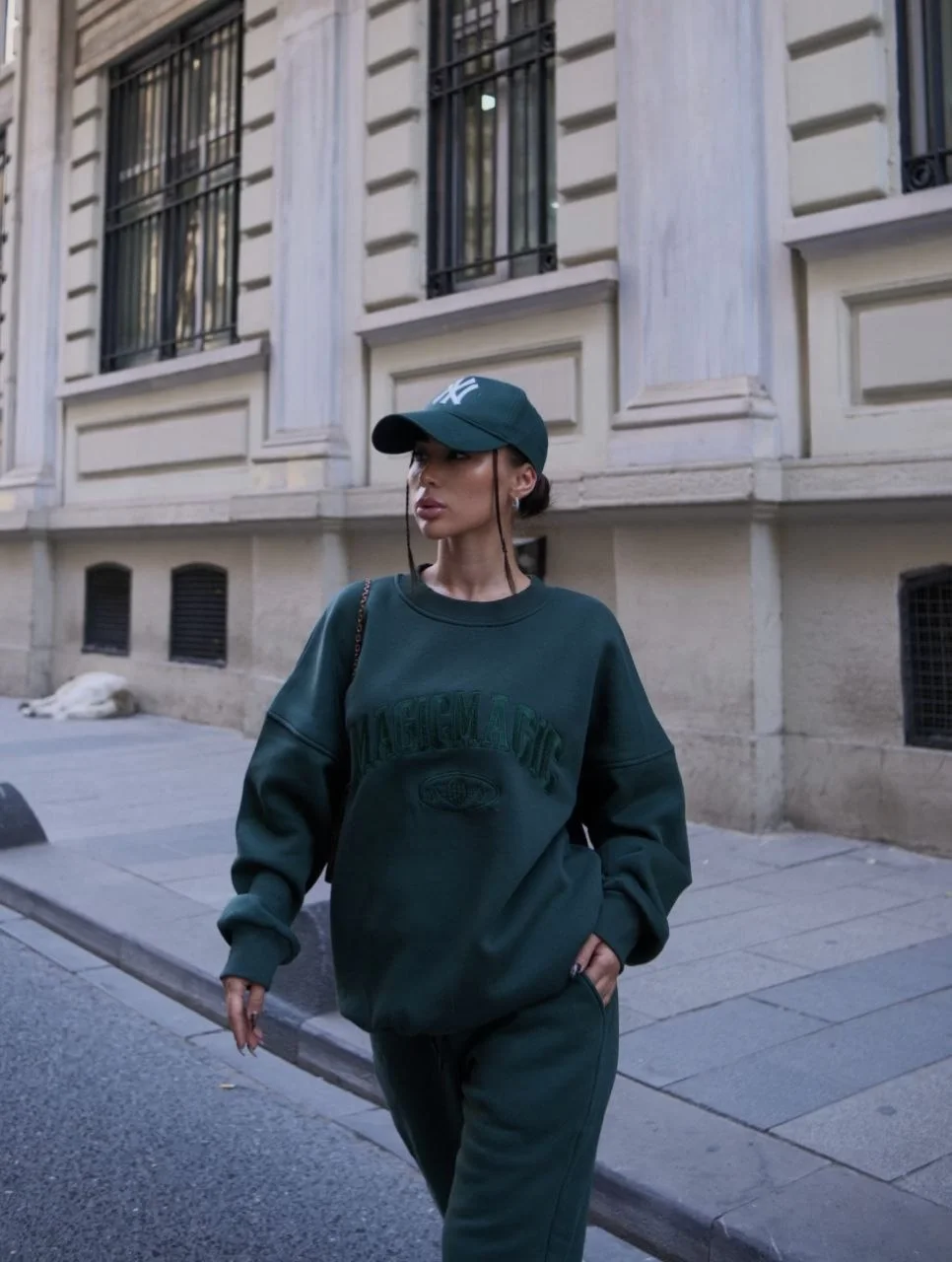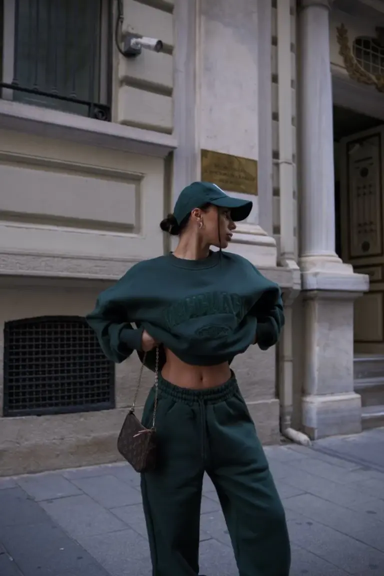 Bisiklet Yaka Nakış İşlemeli 3 İplik Pamuklu Sweat Alt-Üst Takım – Yeşil
