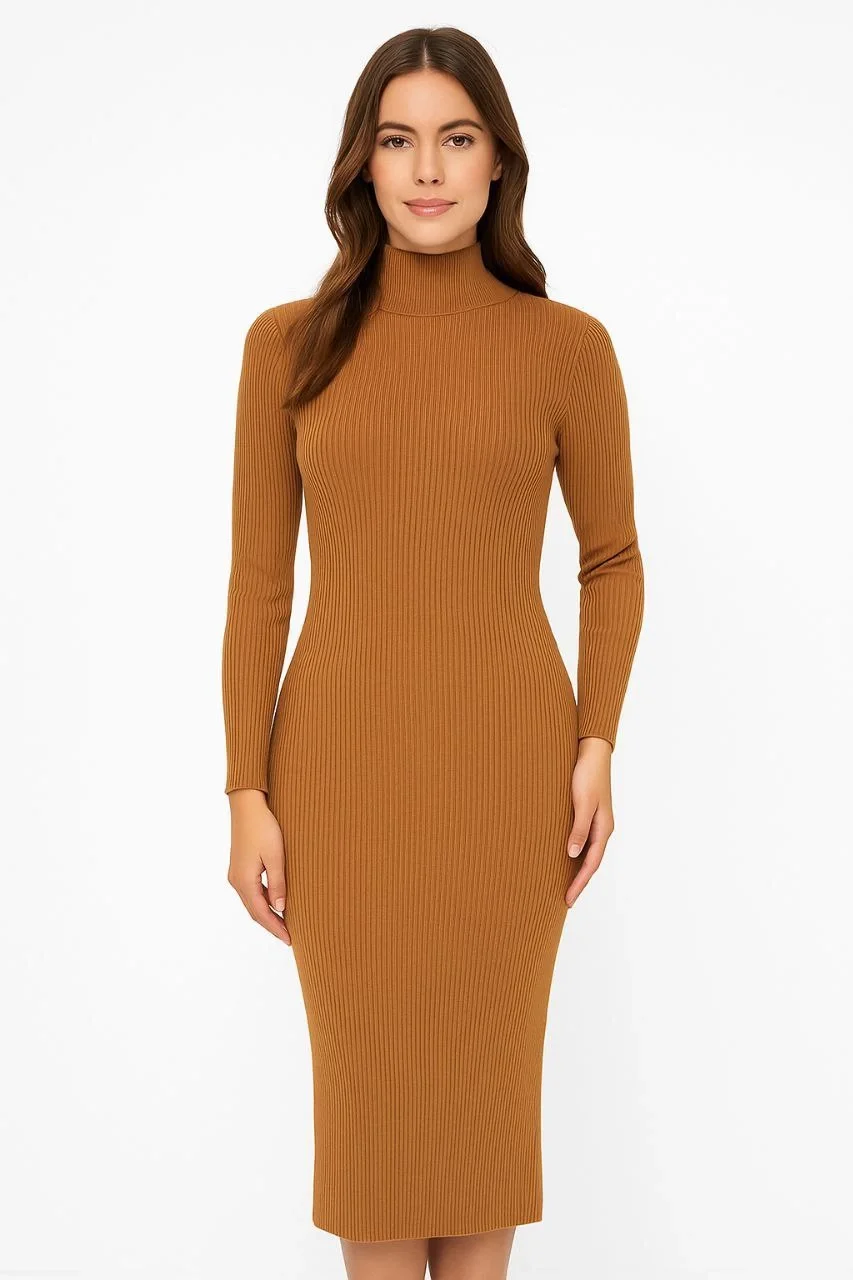 Boğazlı Triko Elbise Uzun Fitilli Esnek Dokuma Tam Kalıp Baharlık 130 – Kahverengi