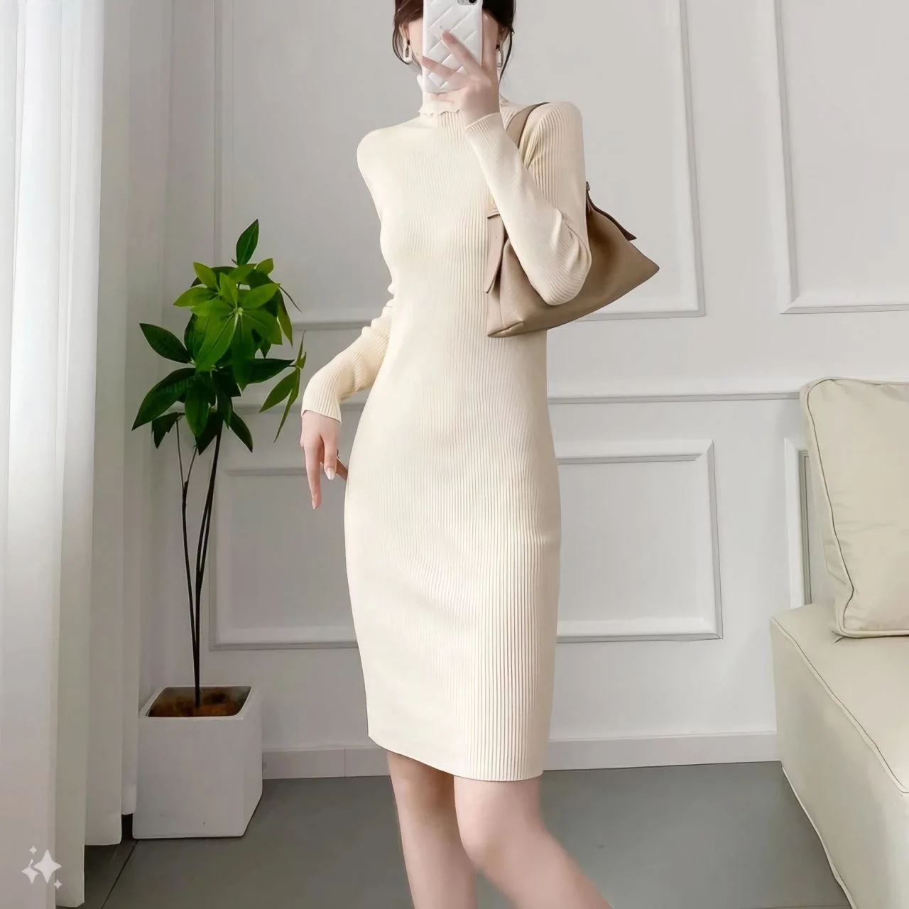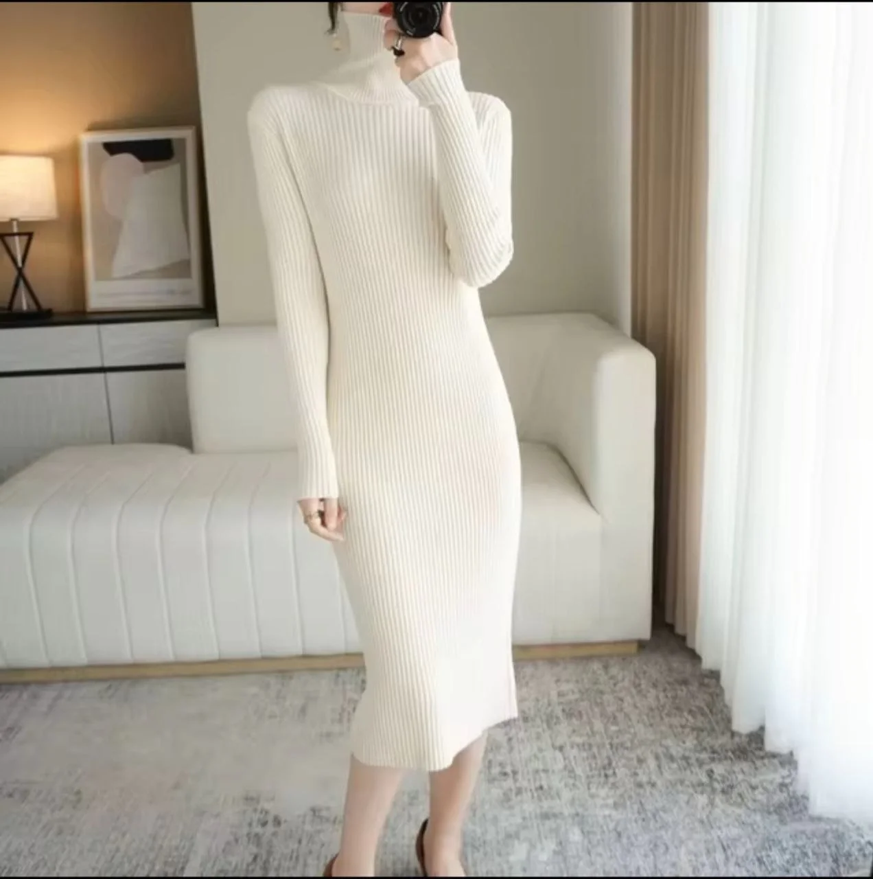 Boğazlı Uzun Fitilli Triko Dokuma Elbise – Beyaz
