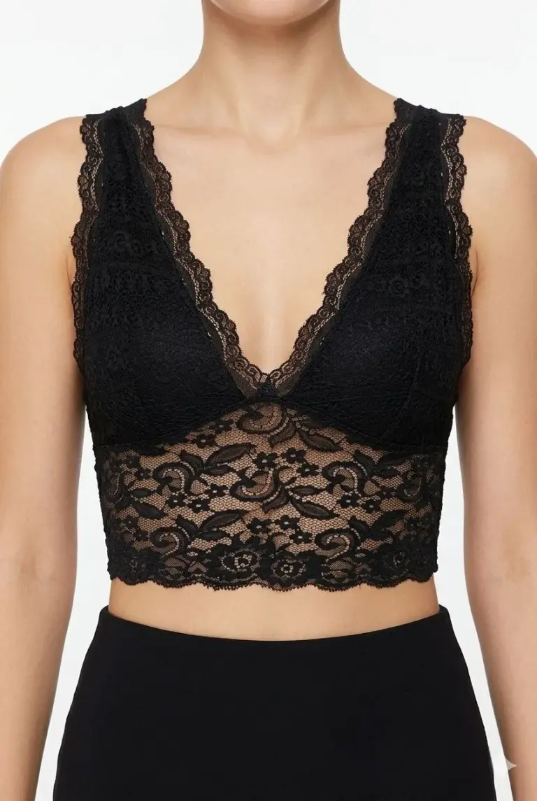 Dantel Bralet Crop Sütyen V Yaka Askılı Şık Esnek Rahat – Siyah