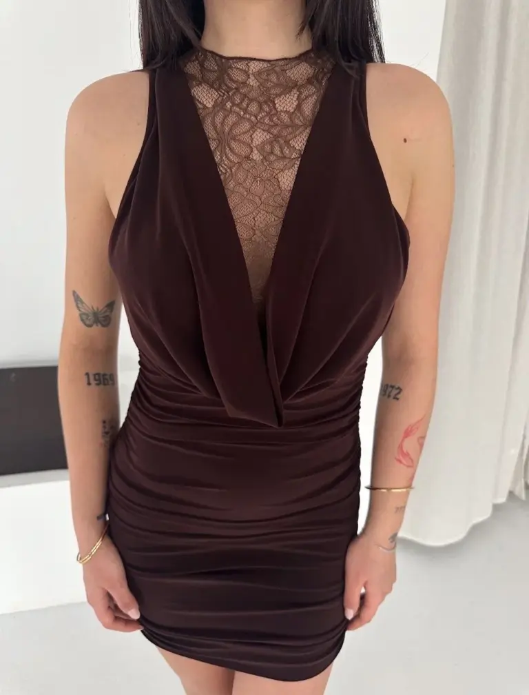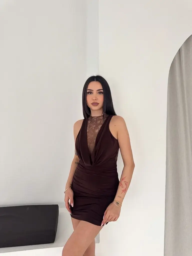 Dantel Detaylı Derin Dekolte Drapeli Mini Elbise Şık Kolsuz – Kahvrenegi