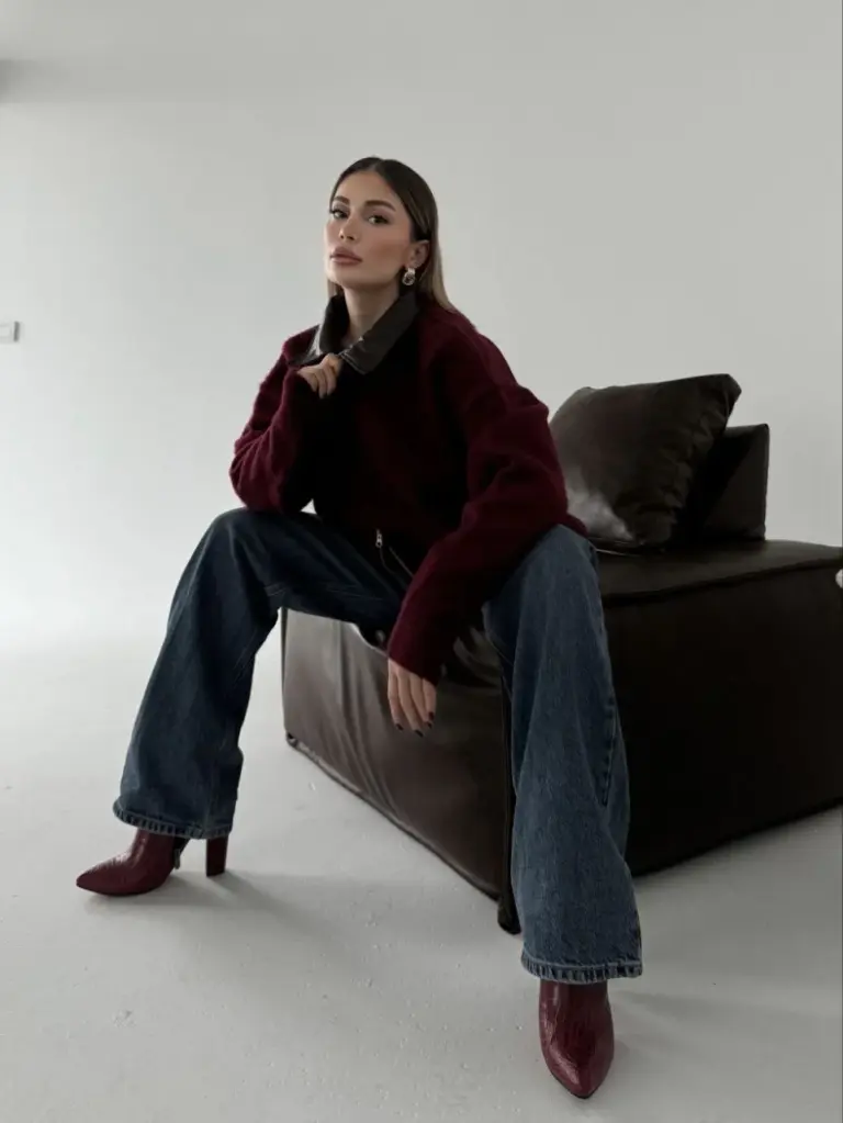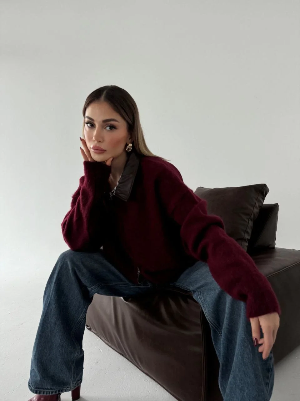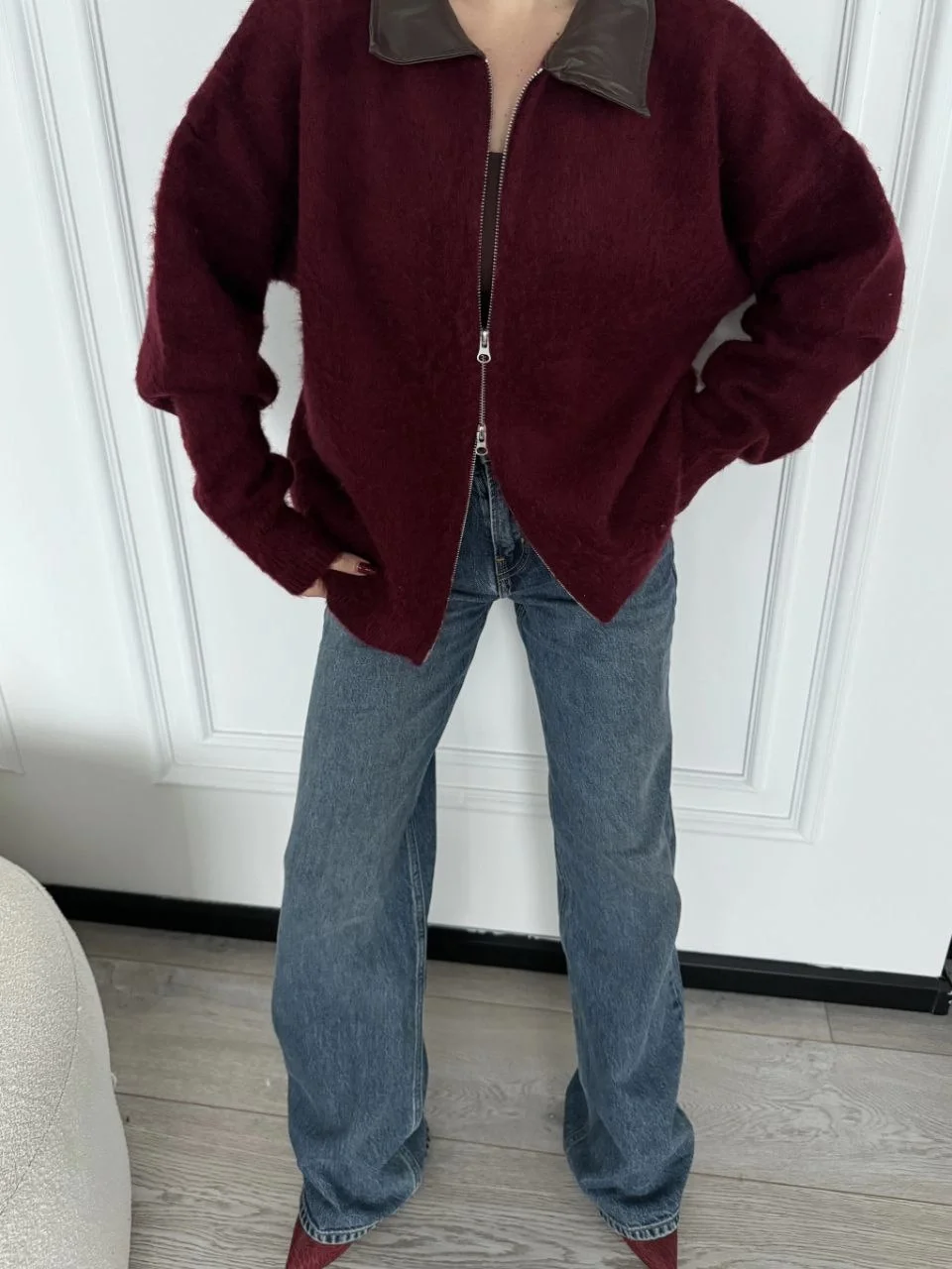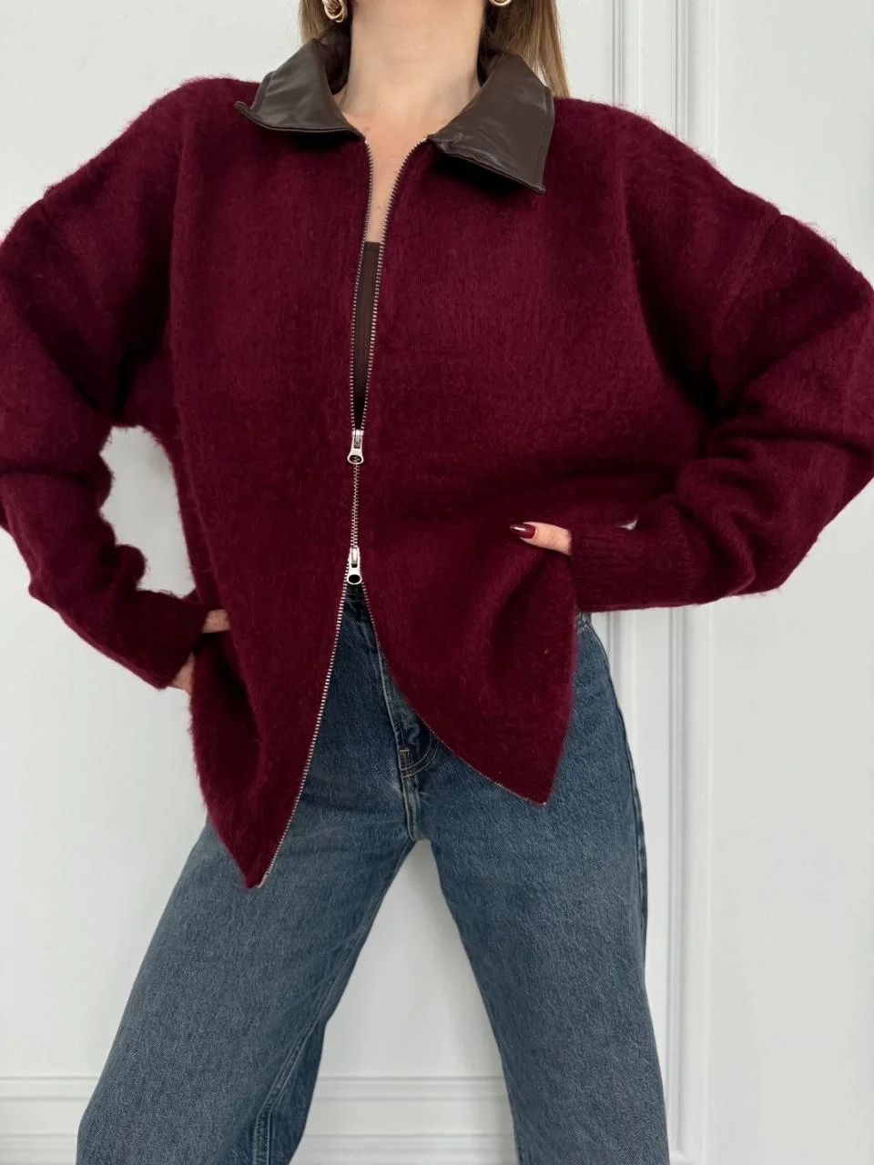 Deri Yakalı Pamuk dokulu Çift Taraflı Çalışan Fermuar Ceket – Bordo