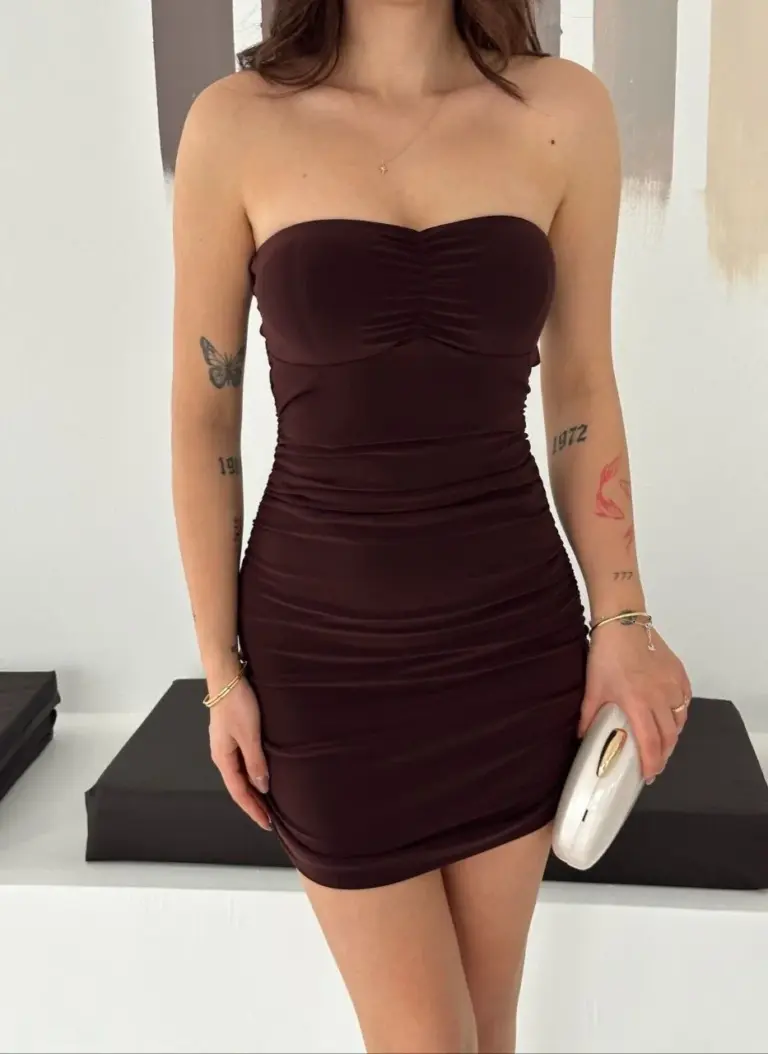 Drapeli Straplez Mini Elbise Esnek Kumaş Vücuda Oturan Gece Elbisesi – Kahverengi