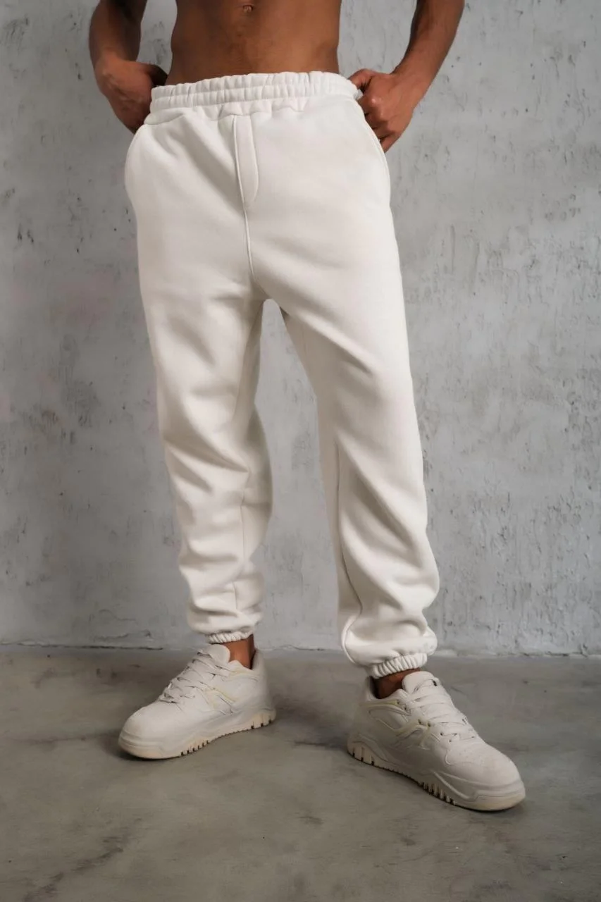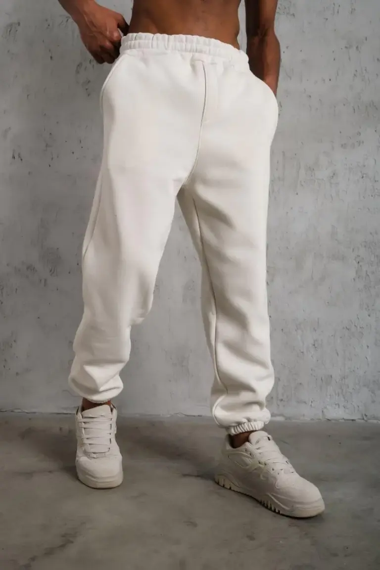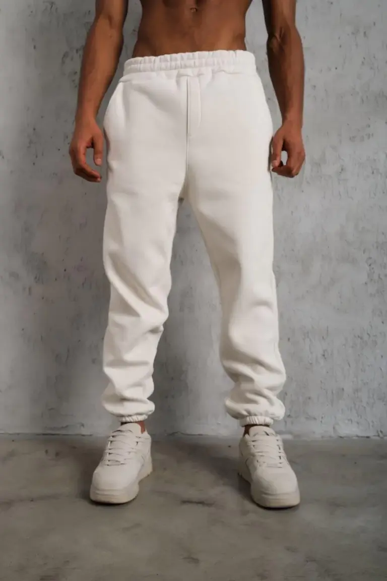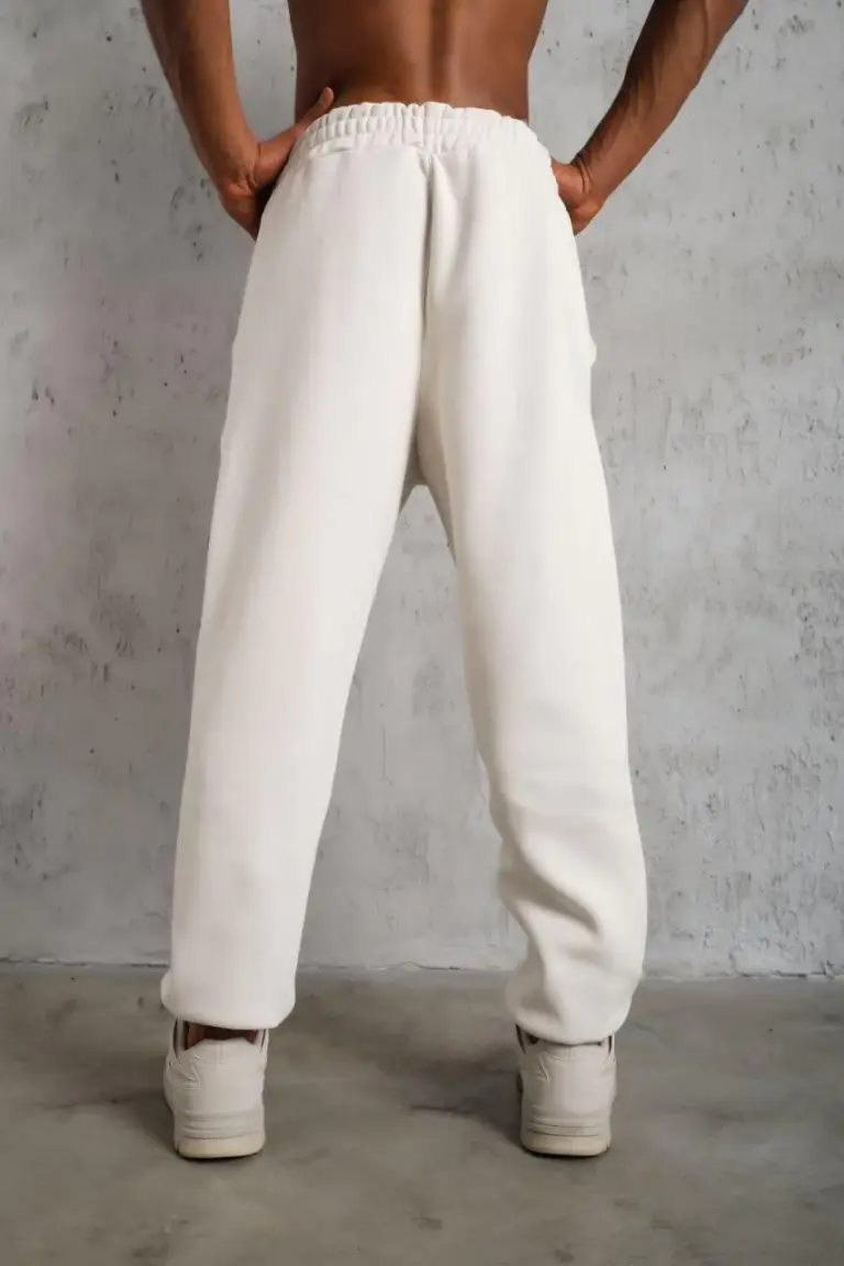 Erkek3 İplik Pamuklu Alt Eşofman Paça Lastikli Pantolon – Beyaz