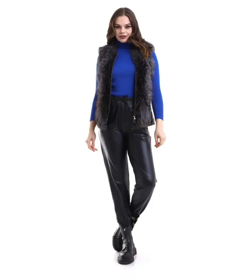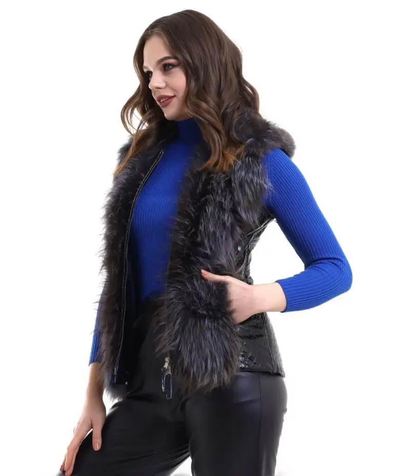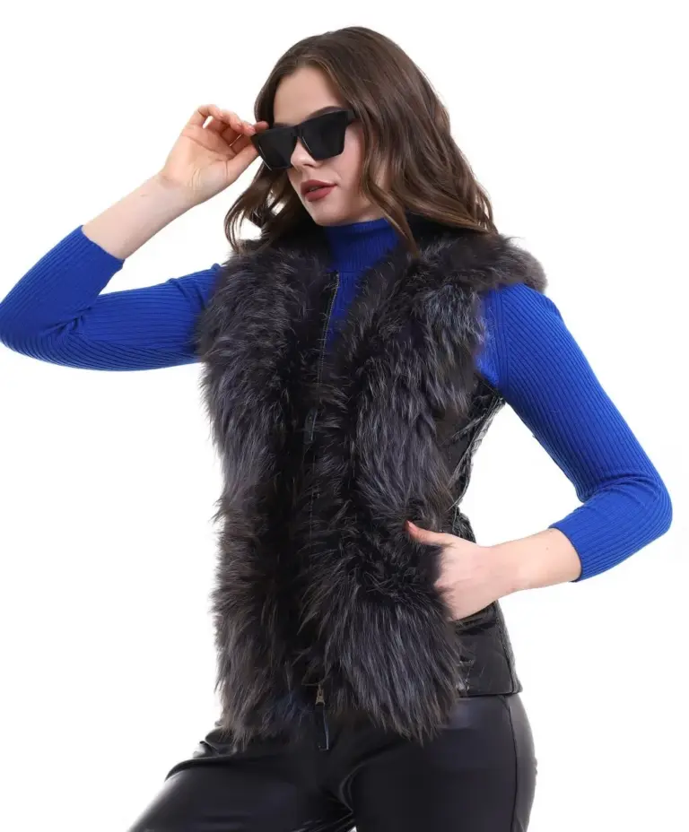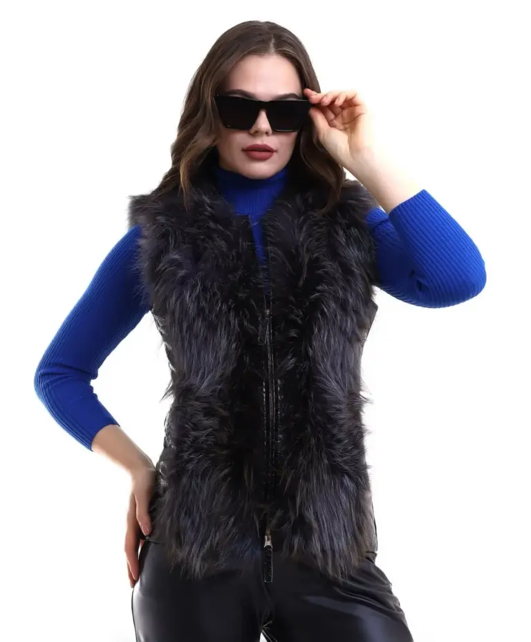 Fermuarlı Koyun Derisi Tilki Kürkü – Siyah