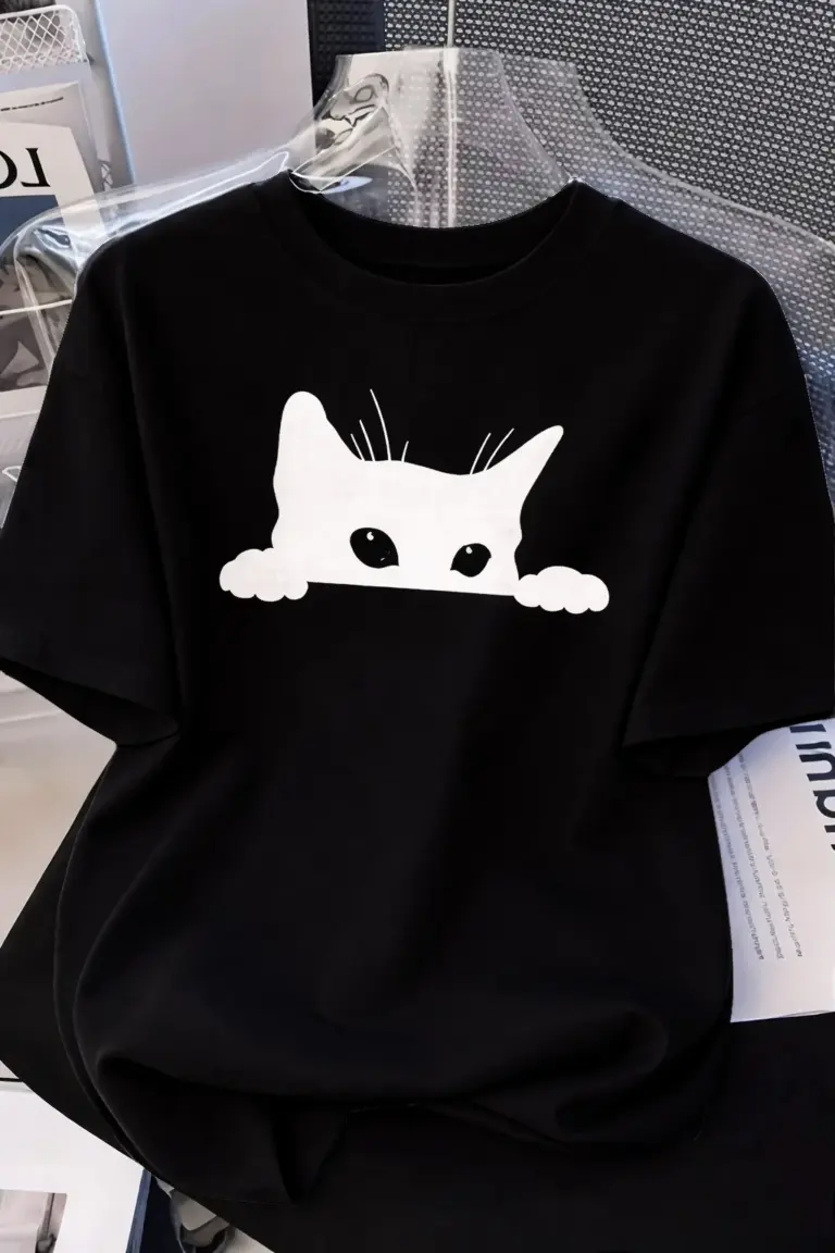 Kadınlar için Siyah Kedi Grafik Tişört – Oversize Kısa Kollu Üst Nefes Alabilir – Siyah