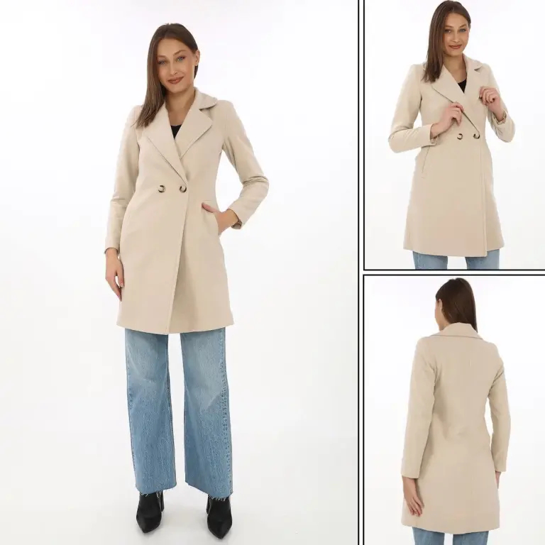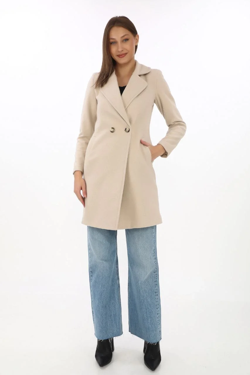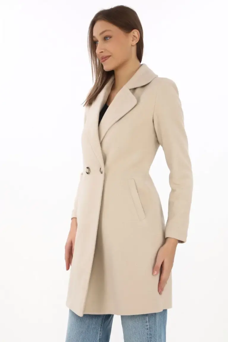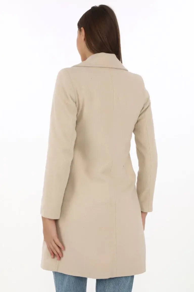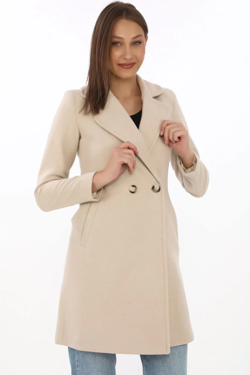 Kaşe Kaban Siyah Yünlü Dokuma Kruvaze Yaka Astarlı Cepli Kuşaklı Uzun Boy – Bej