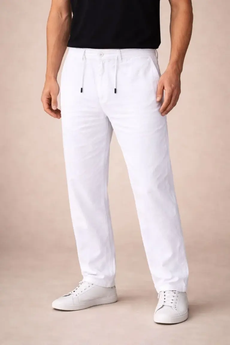 Keten Cepli Pantolon Lastikli Bel Bağcıklı Önden Fermuarlı – Beyaz