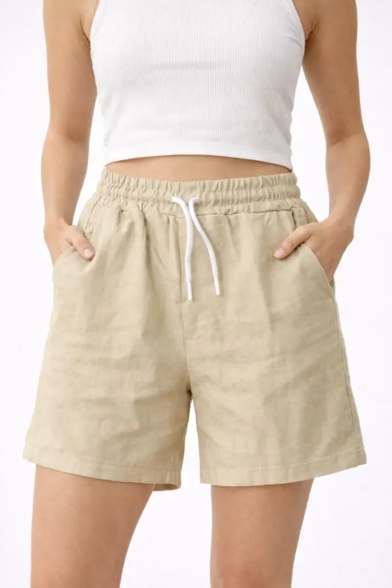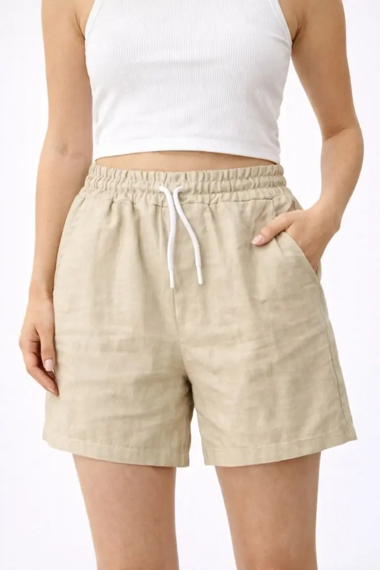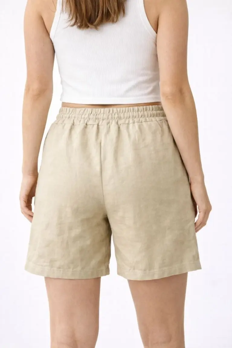 Keten Kumaş Cepli Rahat Kesim Bel Lastikli Şort – Bej