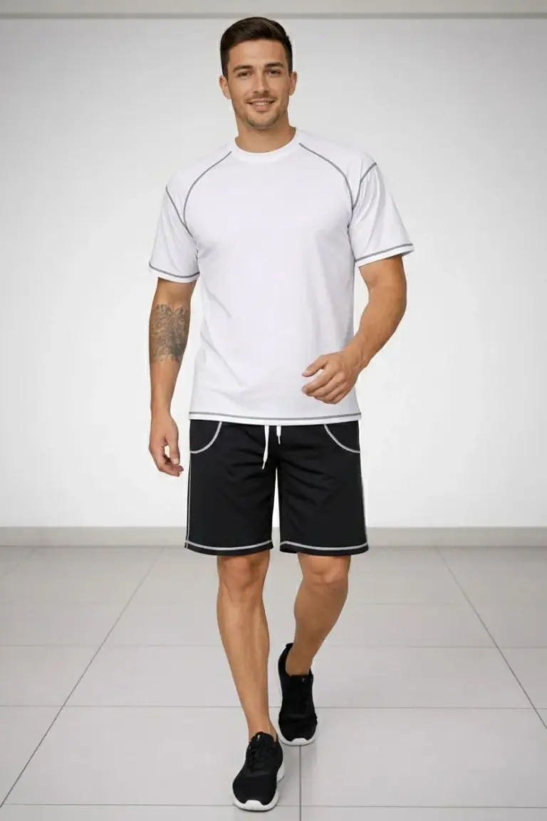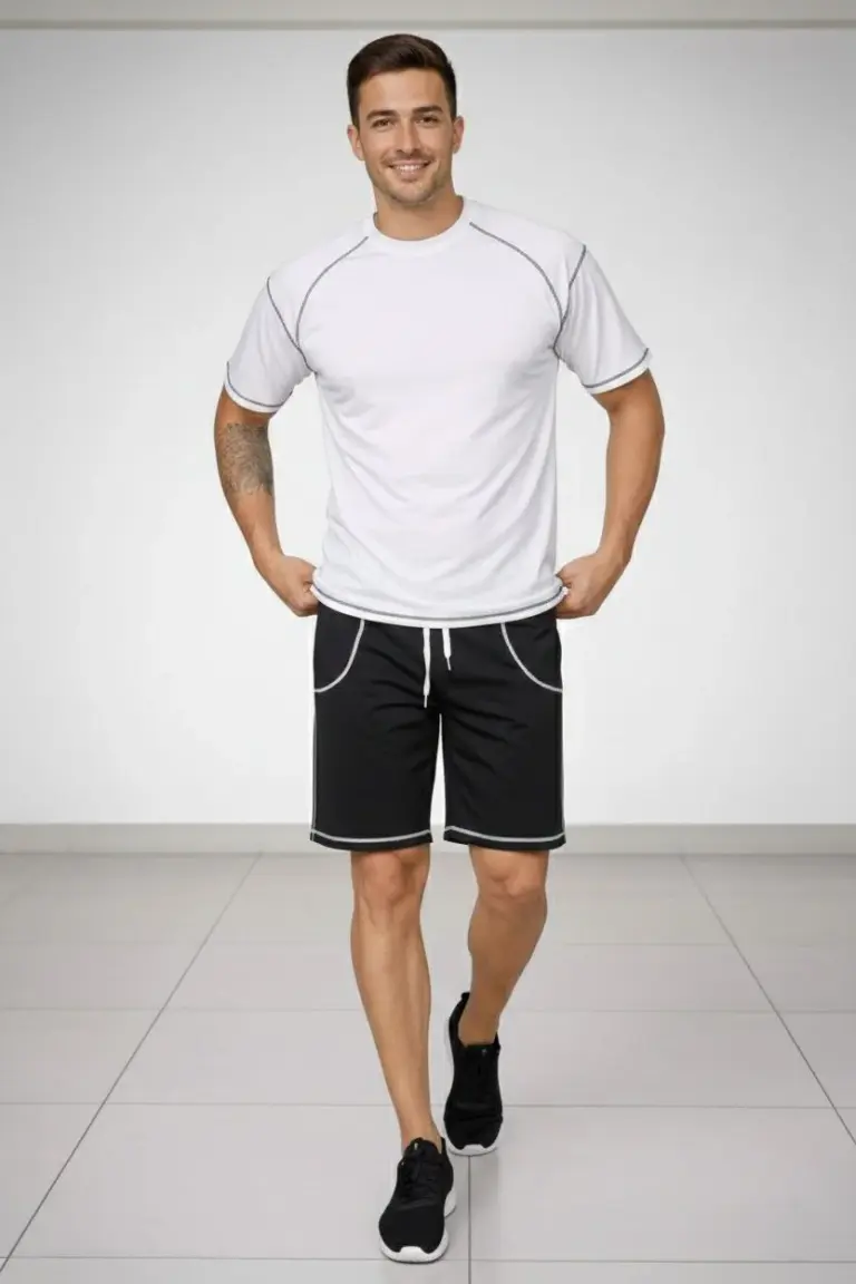 Kısa Kol Oversize Kalıp Tişört Şort ikili Takım Kontrast Dikişli – Beyaz