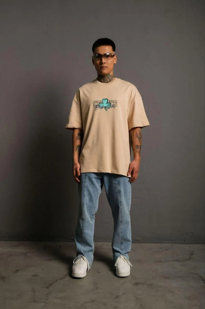 Kısa Kol Yazlık Tişört Bisiklet Yaka Baskılı Oversize T-Shirt – Bej