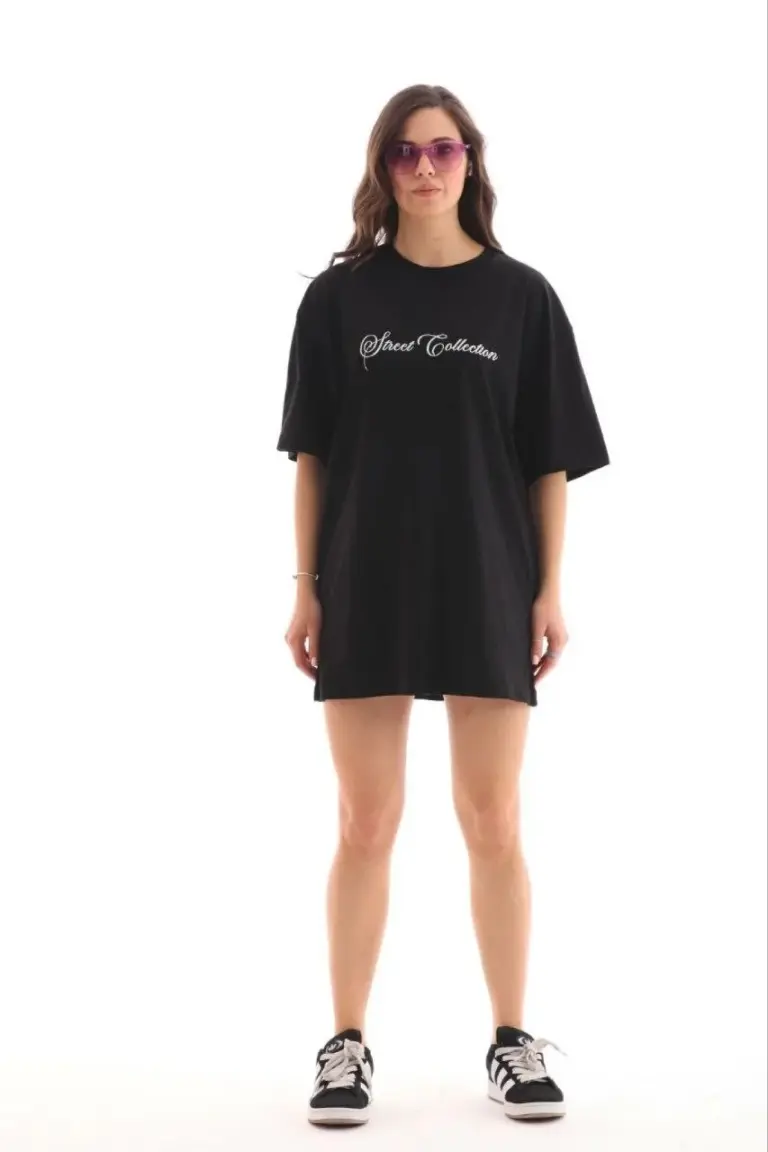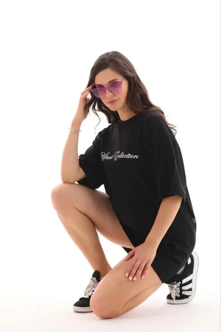Kısa Kol Yazlık Tişört Bisiklet Yaka Baskılı Oversize T-Shirt – Siyah