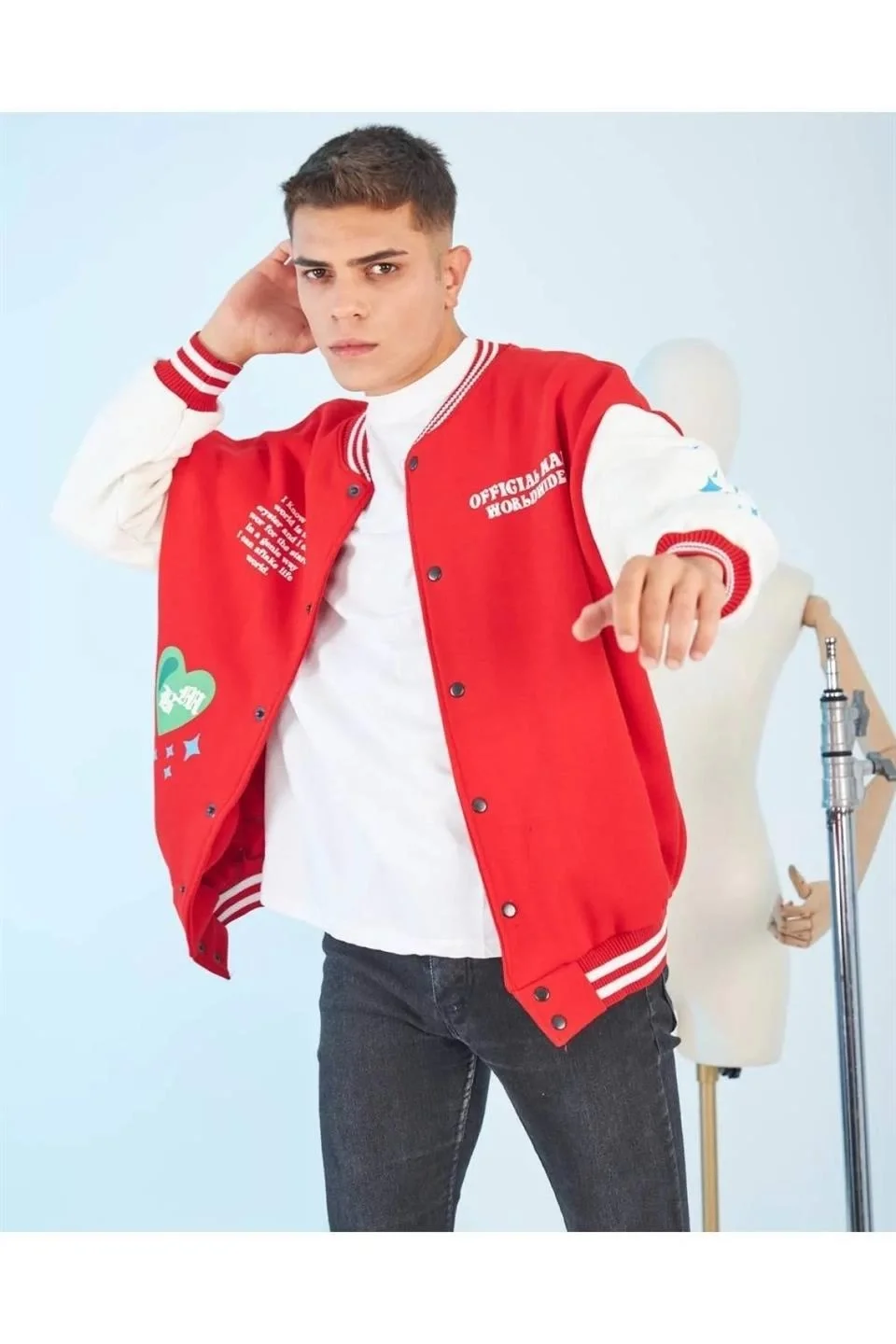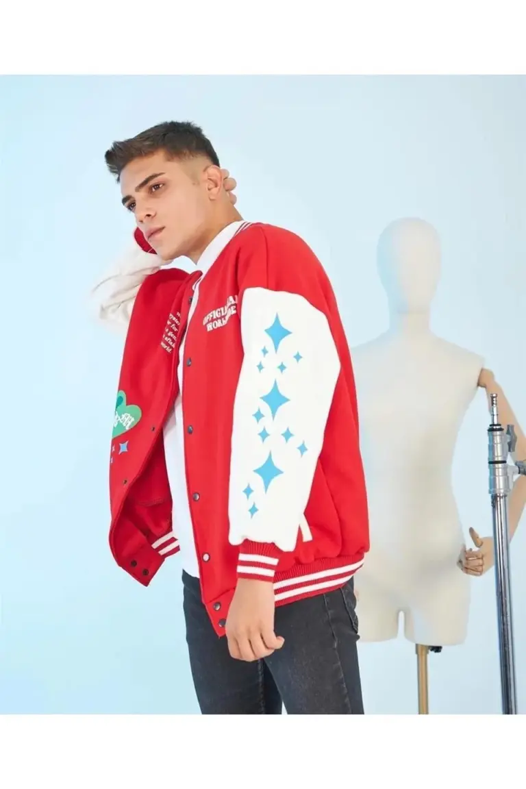 Kolları Yıldız Sırt Baskılı Oversize Kolej Ceket – Kırmızı