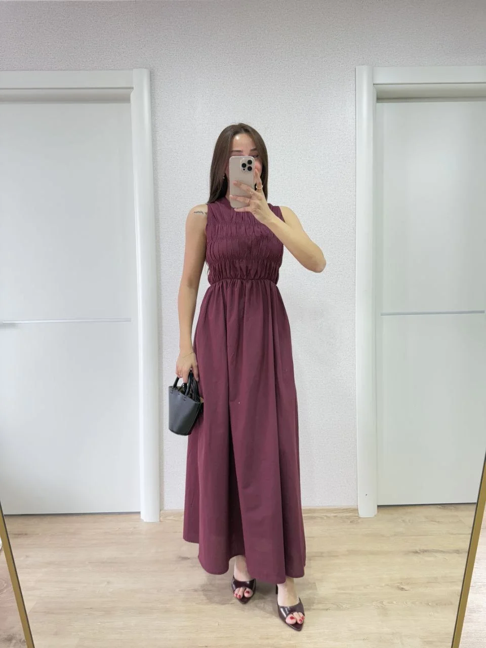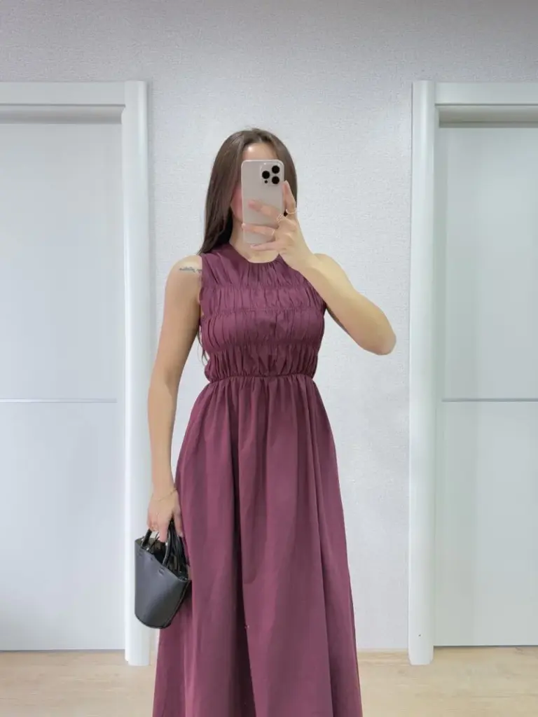 Kolsuz Göğüs Lastıklı %100 Poplin Uzun Elbise – Bordo