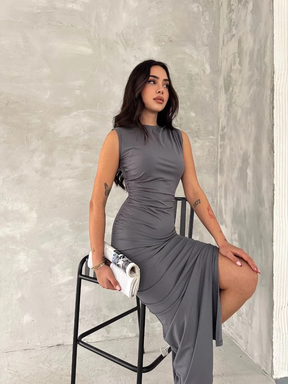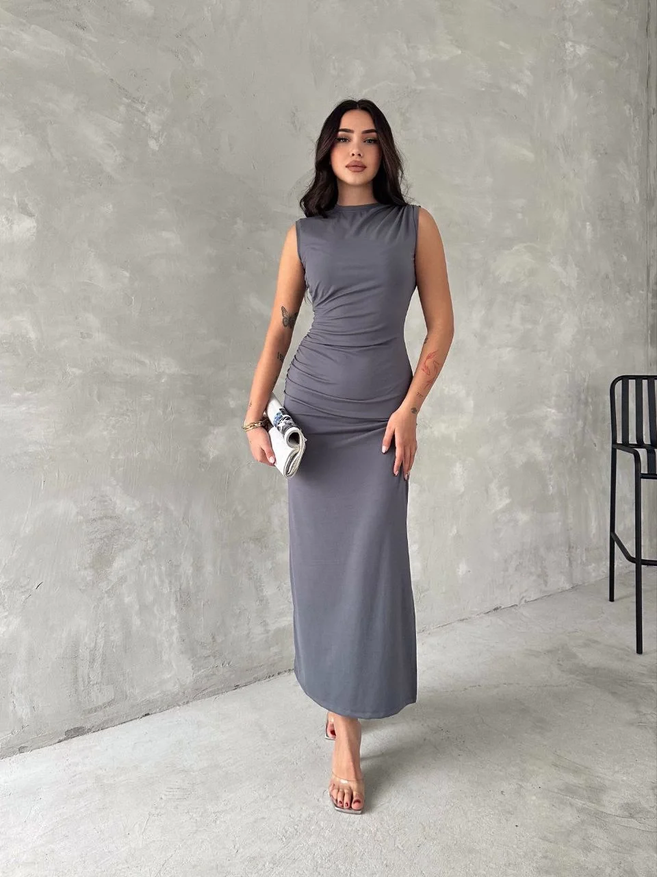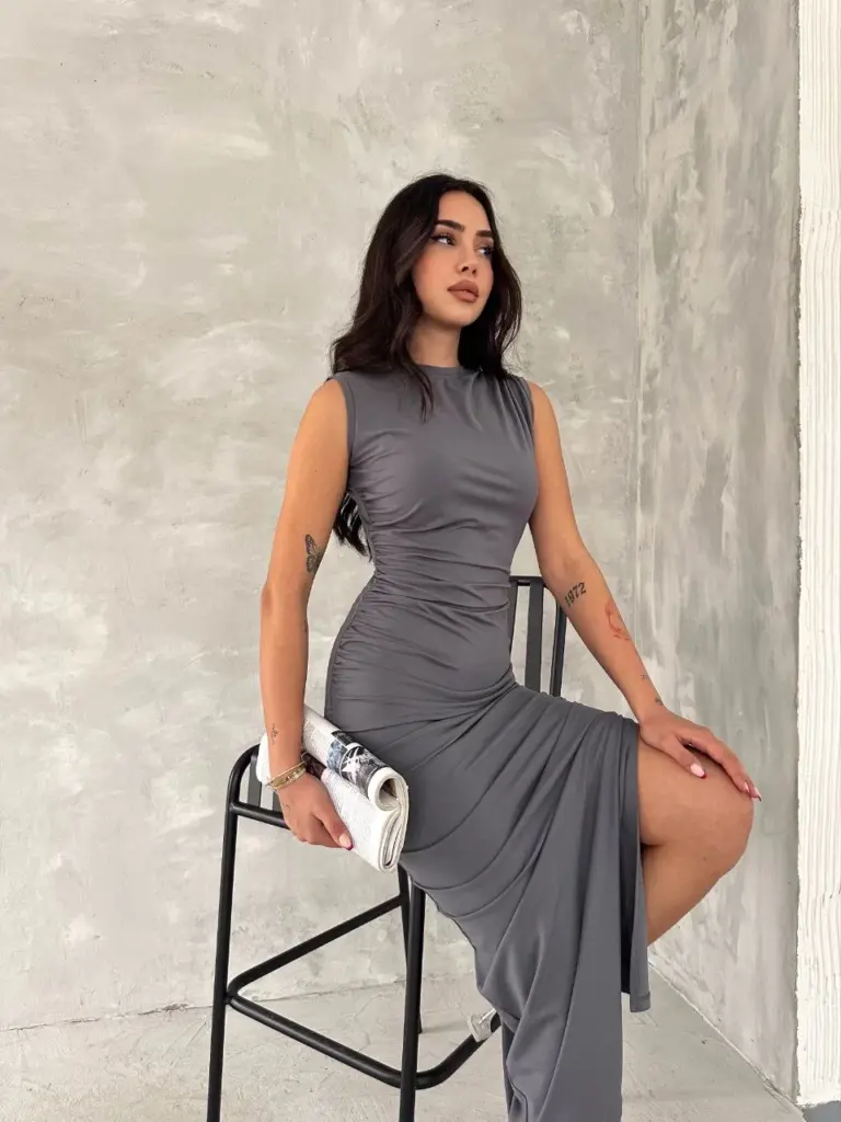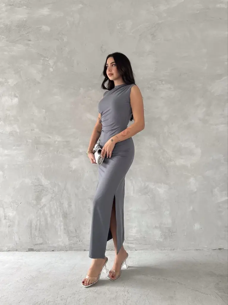 Kolsuz Yırtmaçlı Uzun maxı boy Elbise – Gri