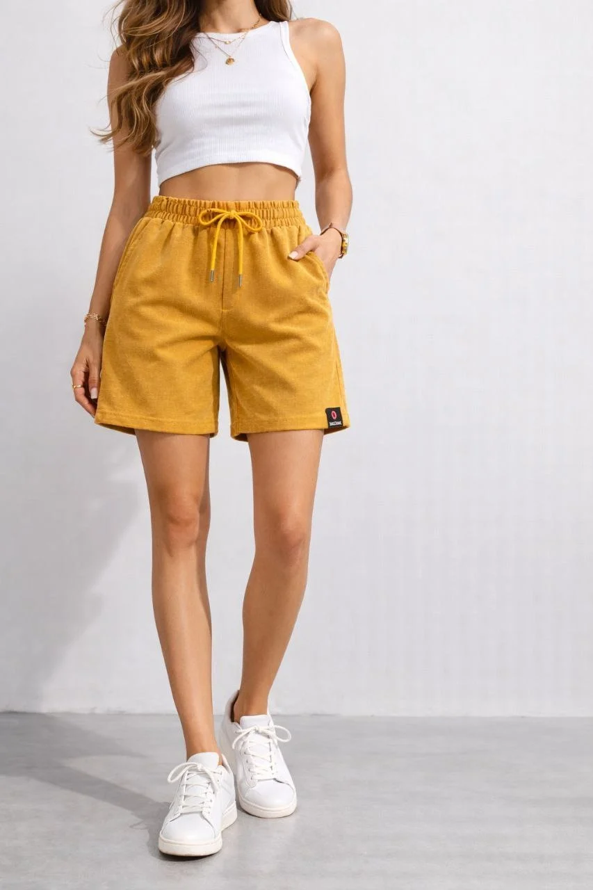 otoban Dokuma Kumaş Beli Lastikli, Cepli, Yazlık Şort – Hardal