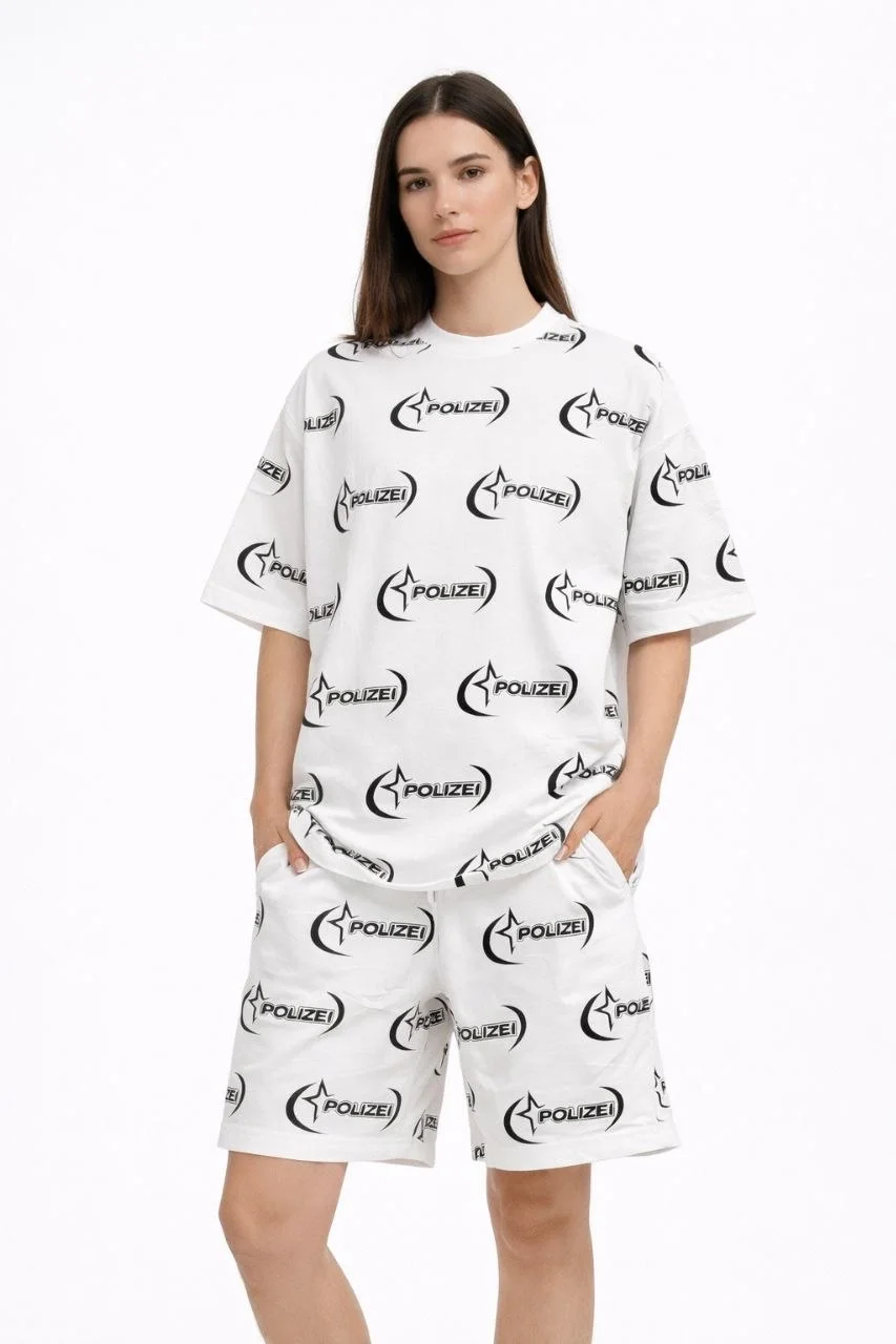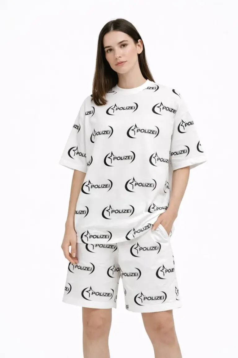 Oversize Ön ve Arka Baskılı Tişört Şort ikili Takım Kombin – Beyaz