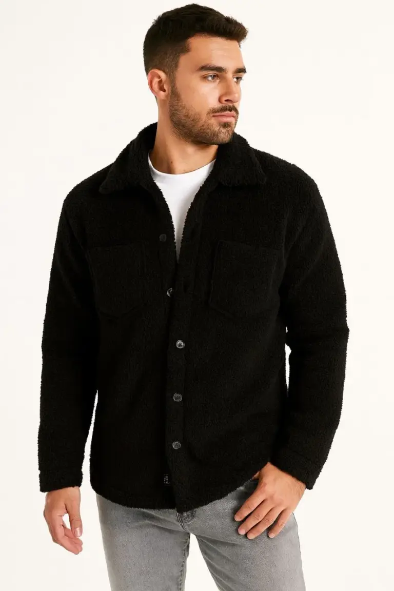 Pelüş Polar Hırka Gömlek Yakalı İlik Düğmeli Göğüs Cepli Yumuşak Dokulu – Siyah