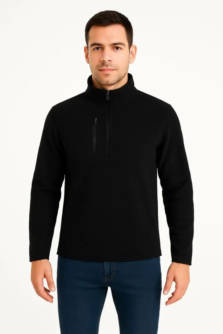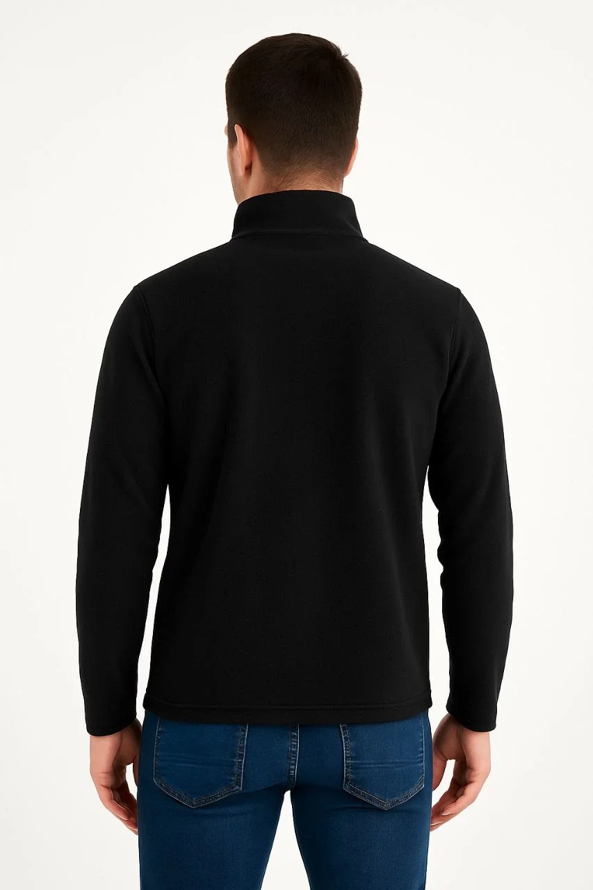 Erkek Polar Kazak Dik Yaka Yarım Fermuarlı Fermuarlı Göğüs Cepli Siyah Biyeli – Siyah