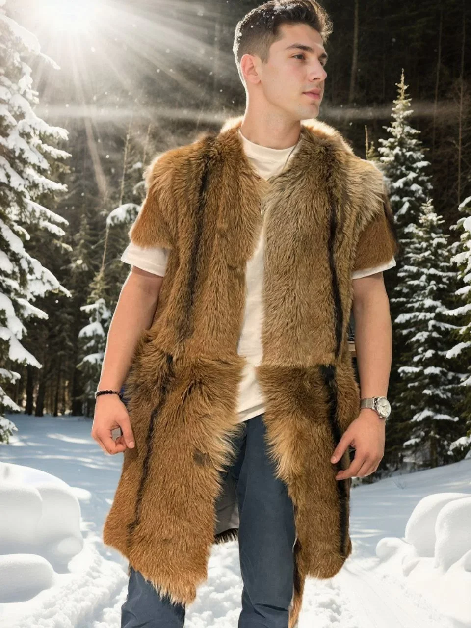 Premium Doğal Kürk deri Kolsuz Uzun Yelek – Kahve