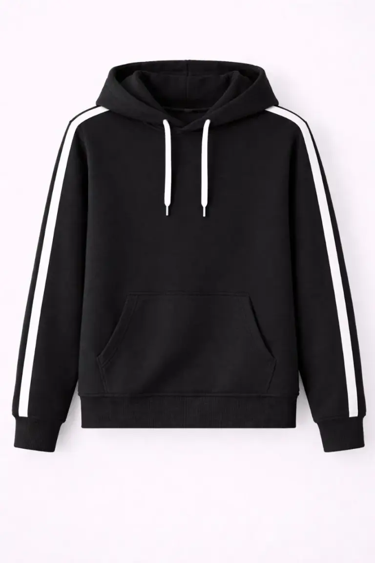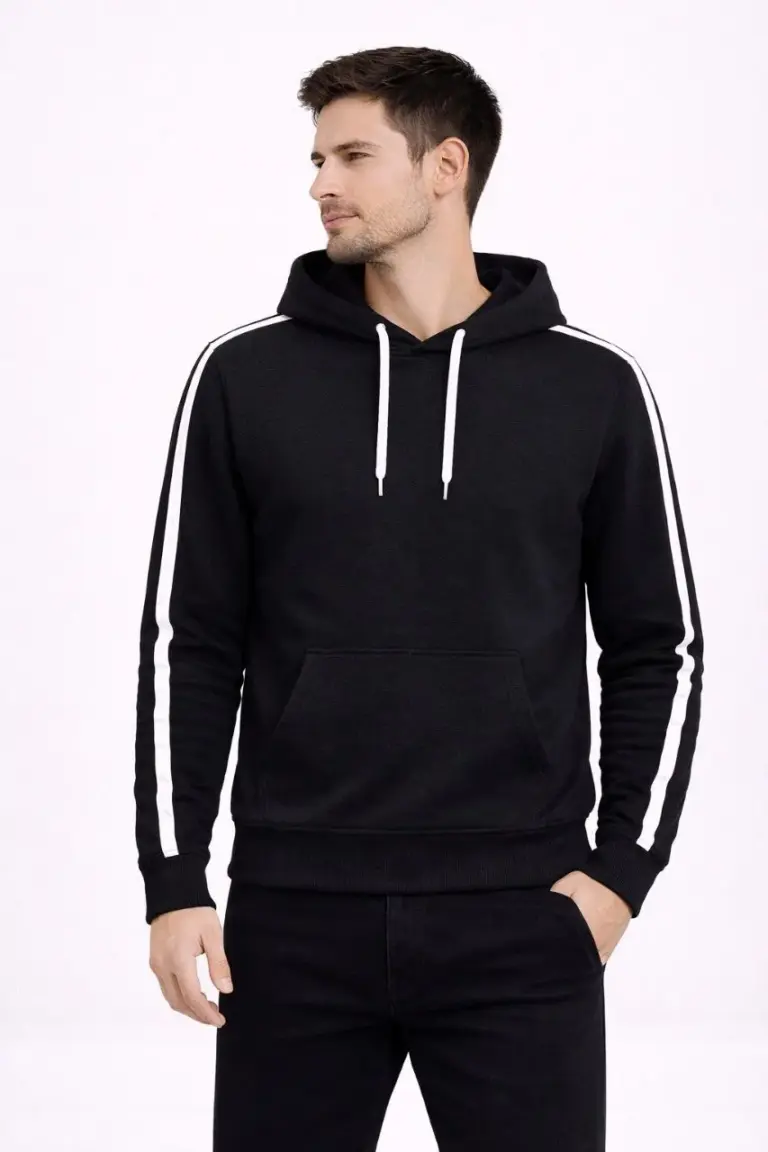 Şeritli Kapüşonlu Sweatshirt Oversize 3 iplik Pamuklu Hoodei – Siyah