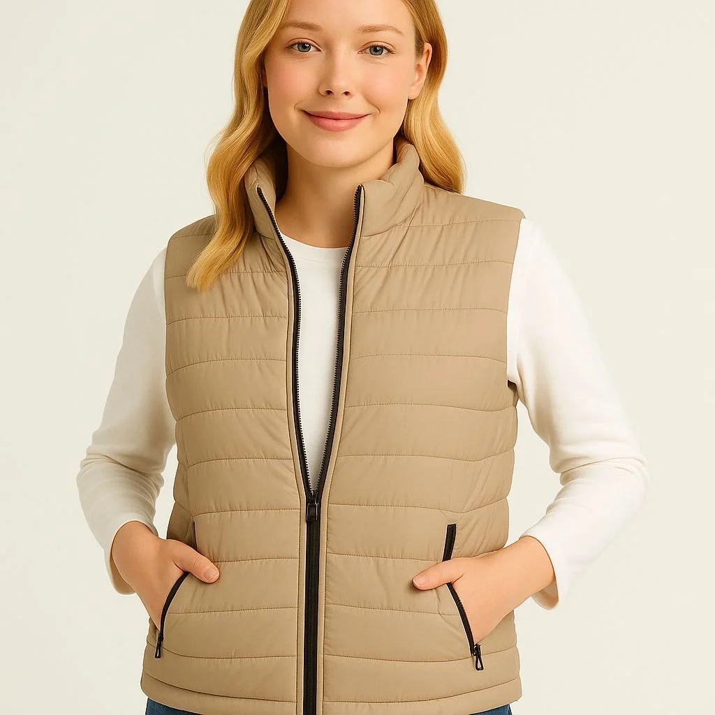 Şişme Fermuarlı Su İtici Kapitone Astarlı, Cepli Yelek – Bej
