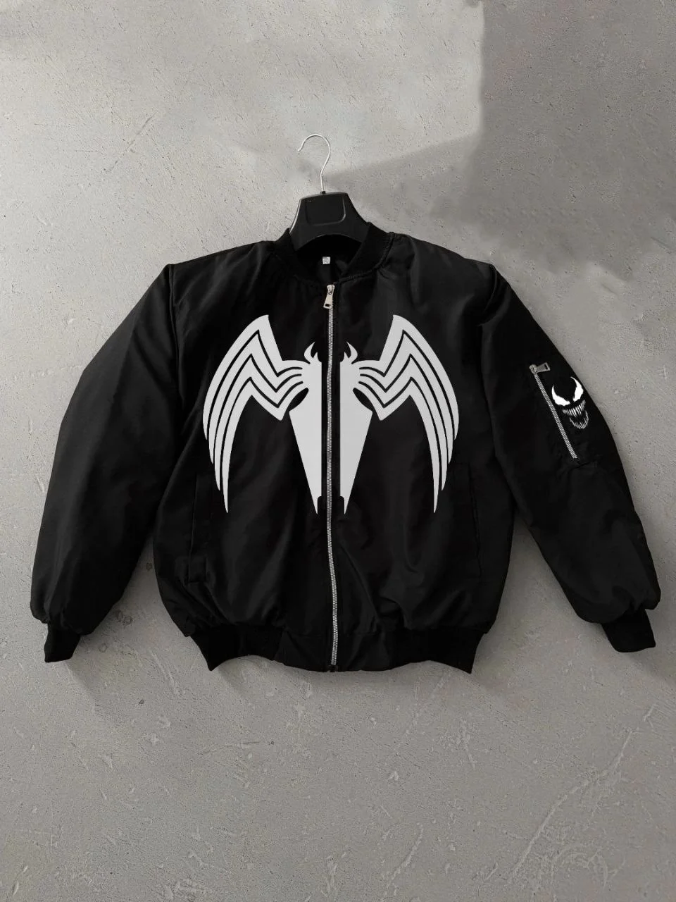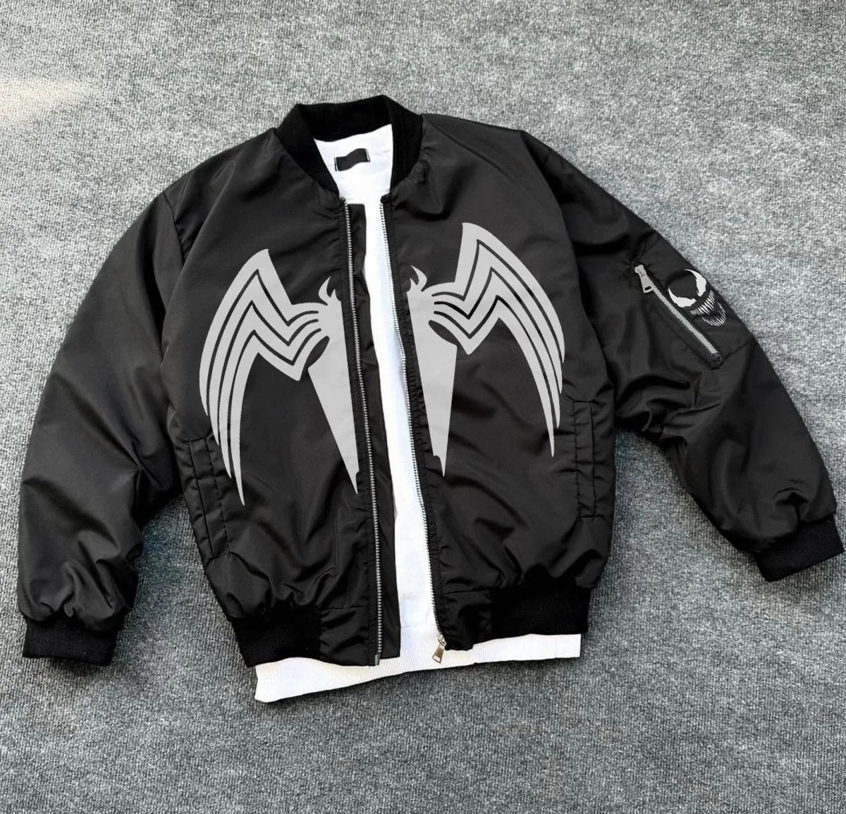 Siyah Bomber Mont Venom Beyaz Örümcek Logolu Fermuarlı Cepli Kapitone – Siyah