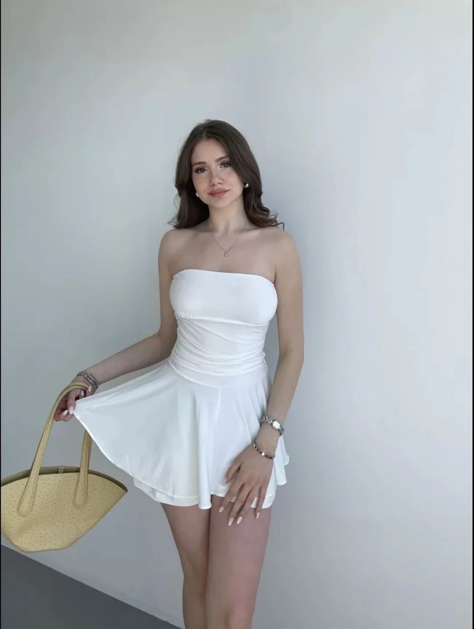 Straplez Mini Etek Görünümlü Şortlu Elbise Büzgülü Şık Yazlık – Beyaz