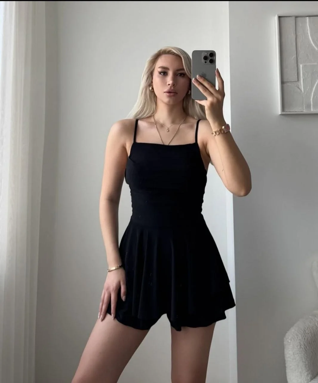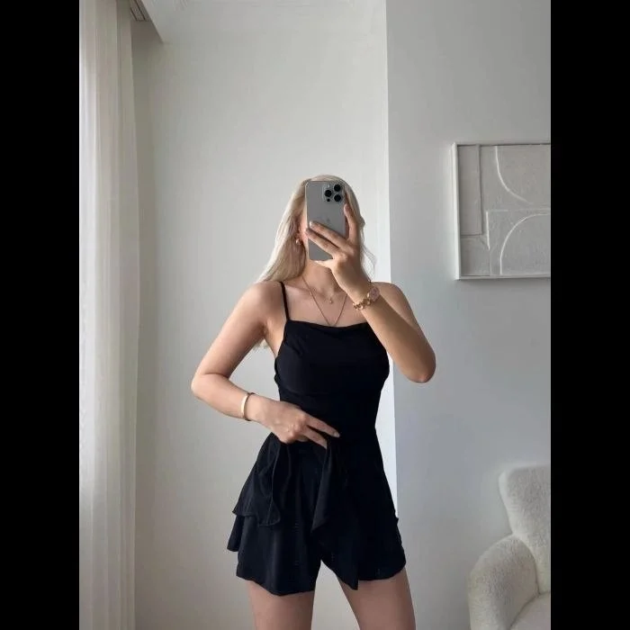 Straplez Mini Etek Görünümlü Şortlu Elbise Büzgülü Şık Yazlık – Siyah
