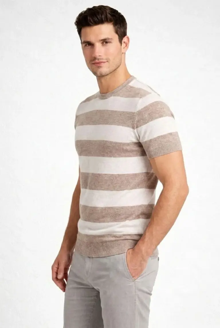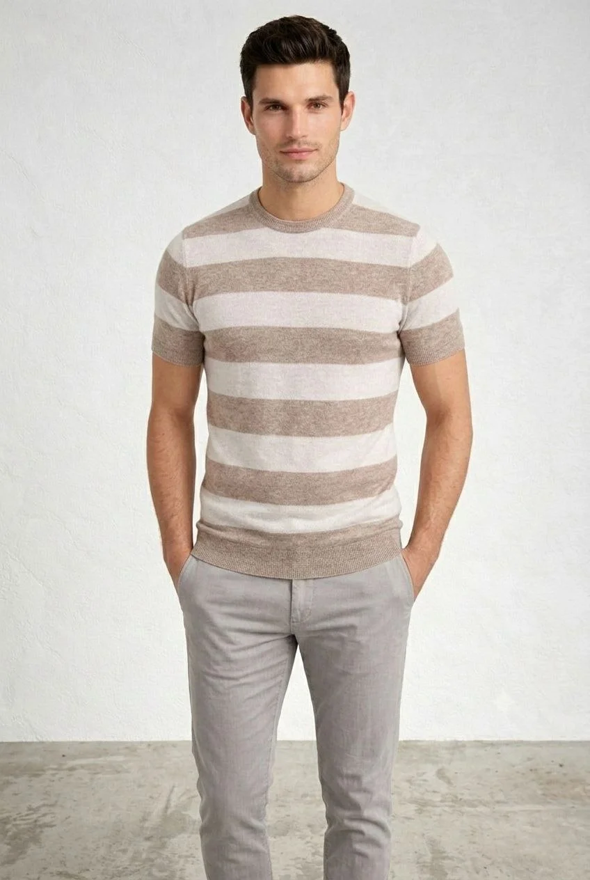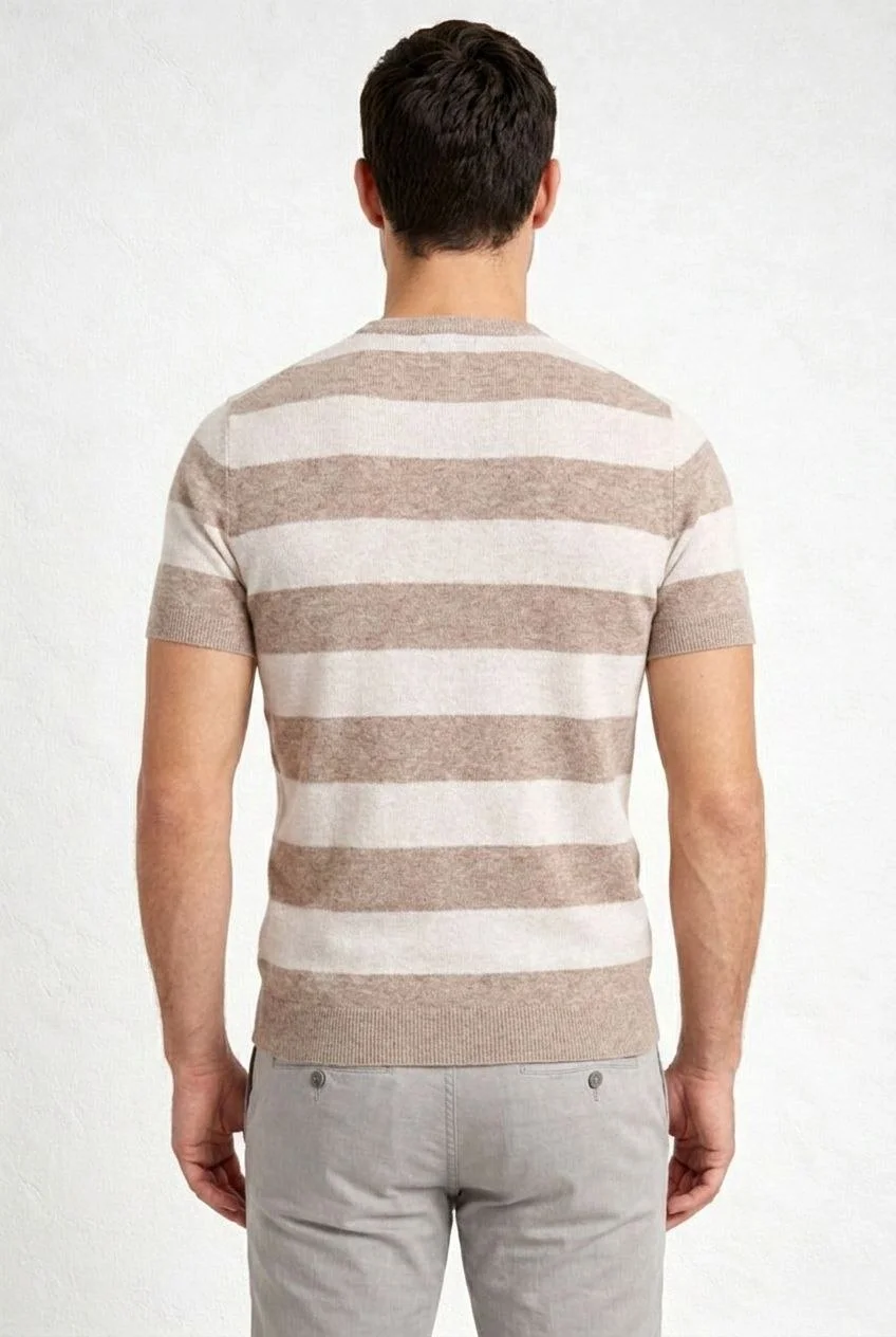 T-shirt Çizgili Triko Kısa Kol Yazlık Dokuma Bisiklet Yaka Tişört – Bej