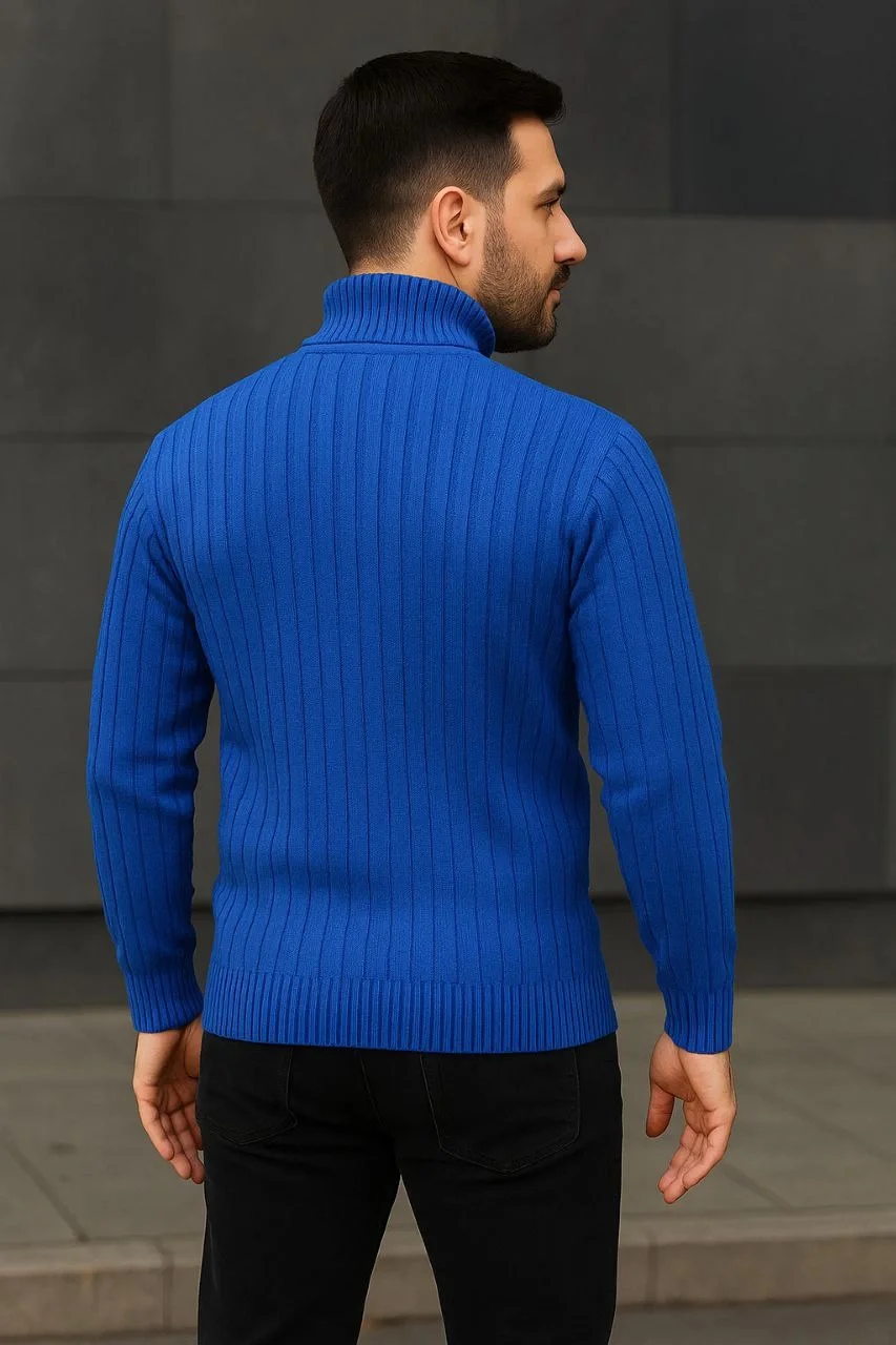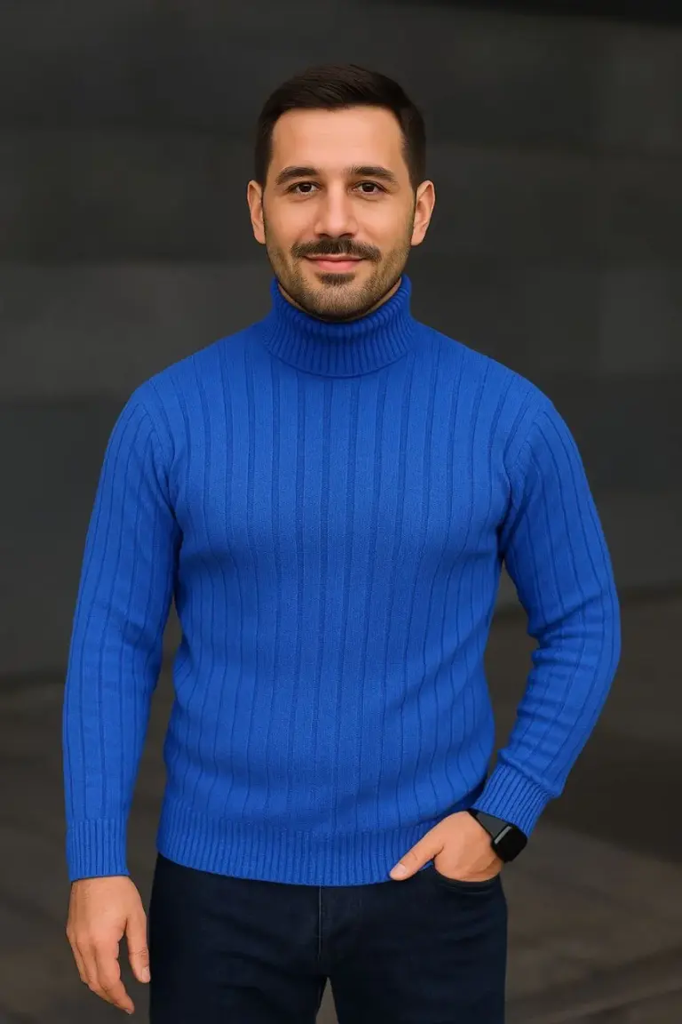 Tam Boğazlı Balıkçı Yaka Triko Kazak Kalın Fitilli – Saks Mavisi