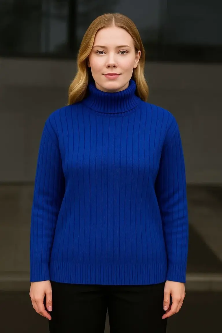 Tam Boğazlı Balıkçı Yaka Triko Kazak Kalın Fitilli – Saks Mavisi